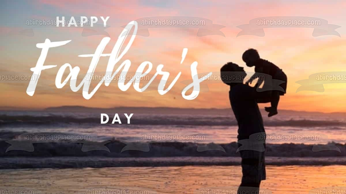 ¡Decora tu pastel con esta imagen de adorno comestible para pastel con temática del Feliz Día del Padre que presenta una silueta de padre y bebé con un fondo del océano!