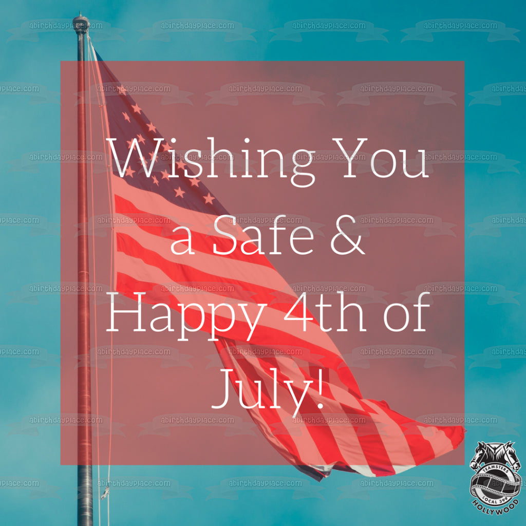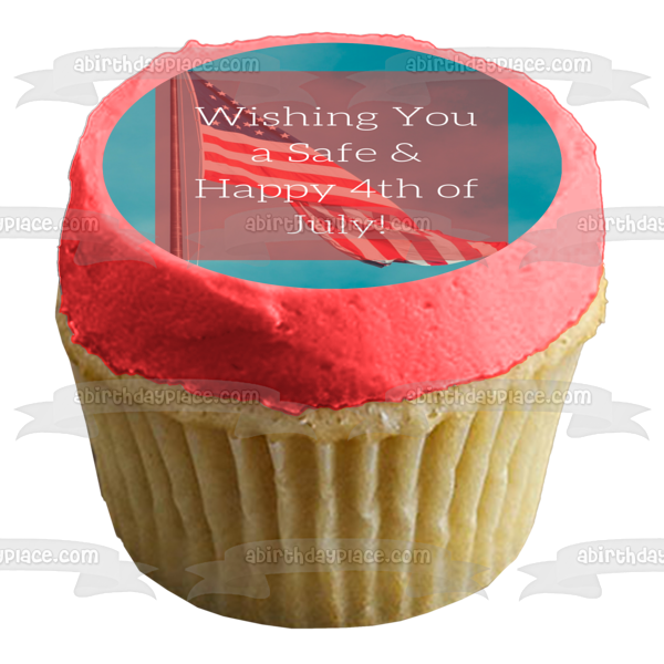 ¡Decora tu pastel con esta imagen de adorno comestible para pastel con el tema del Día de la Independencia que presenta las palabras Deseándote un 4 de julio seguro y feliz y la bandera estadounidense!
