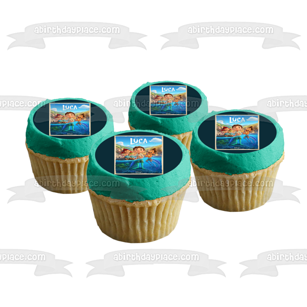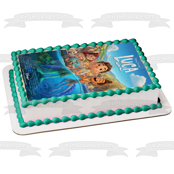 ¡Decora tu pastel con esta imagen de adorno comestible para pastel con el tema del póster de Luca Movit que presenta a Luca, Giulia Marcovaldo y Alberto Scorfano!