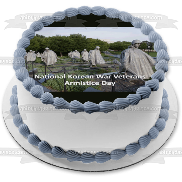¡Decora tu pastel con esta imagen de adorno comestible para pastel con temática del Día Nacional del Armisticio de los Veteranos de la Guerra de Corea con estatuas!