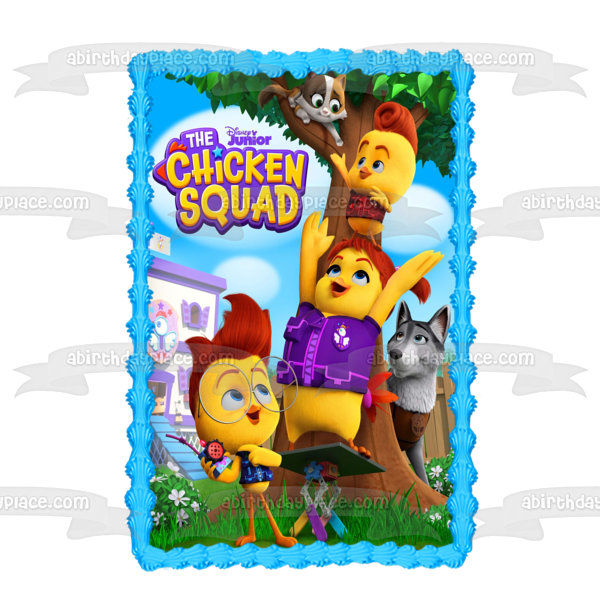 ¡Decora tu pastel con esta imagen de adorno comestible para pastel con temática de Chicken Squad que presenta a Little Boo y al Capitán Tully!