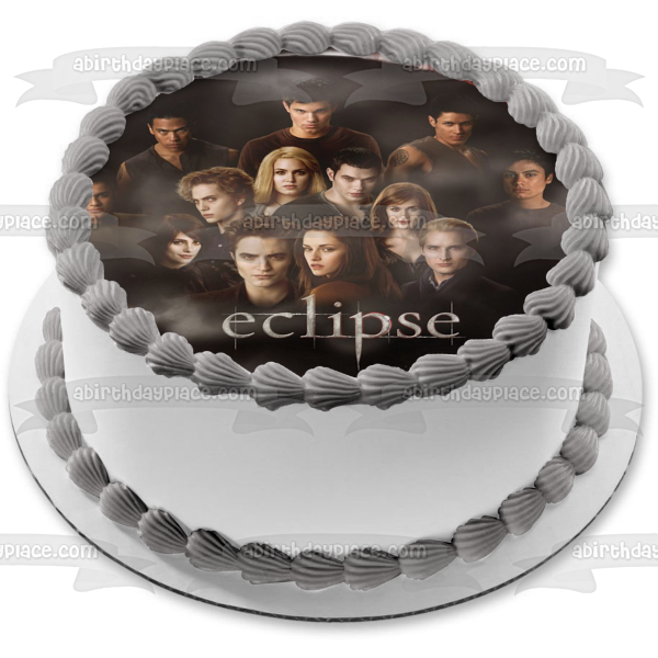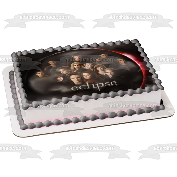 ¡Decora tu pastel con esta imagen de adorno comestible para pastel con temática de La Saga Crepúsculo: Eclipse que presenta a Bella, Edward, Jacob, Rosalie, Alice, Jasper, Emmet, Carlisle y Esme!
