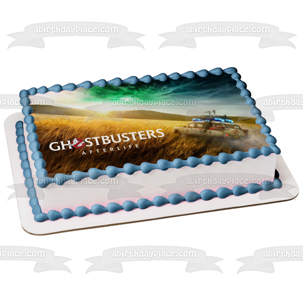 Decora tu pastel con esta imagen de adorno comestible para pastel con temática de Cazafantasmas: Más allá que muestra su auto Ecto-1 en un campo.