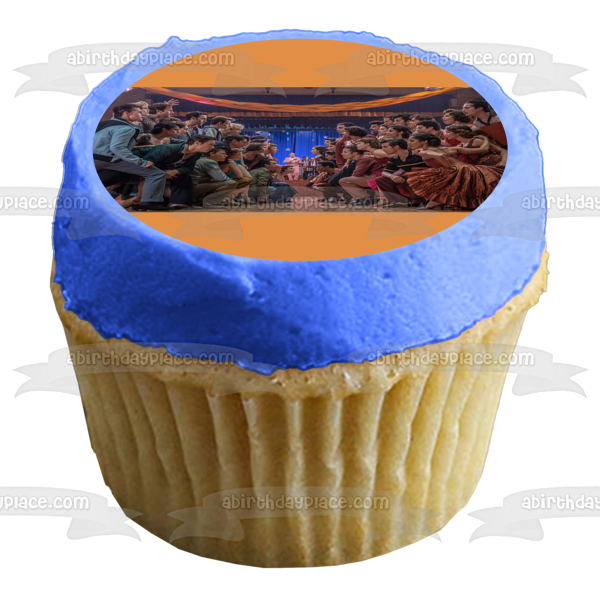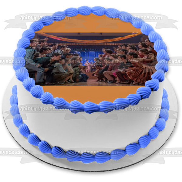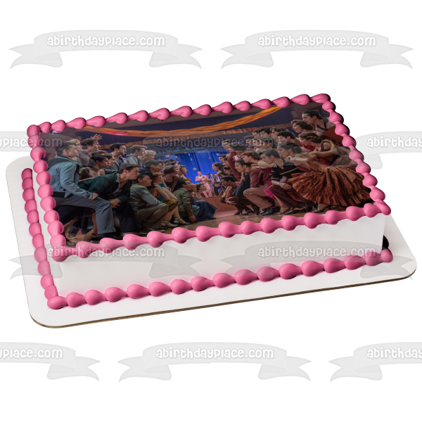 ¡Decora tu pastel con esta imagen de adorno comestible para pastel con temática de West Side Story que presenta a Tony, Velma y María!