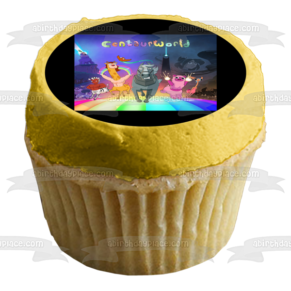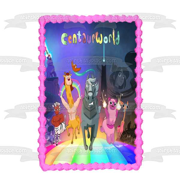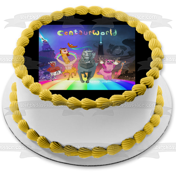 ¡Decora tu pastel con esta imagen de adorno comestible para pastel con temática de Centaurworld que presenta a Wammawink, Durpleton, Horse, Ched y Rider!