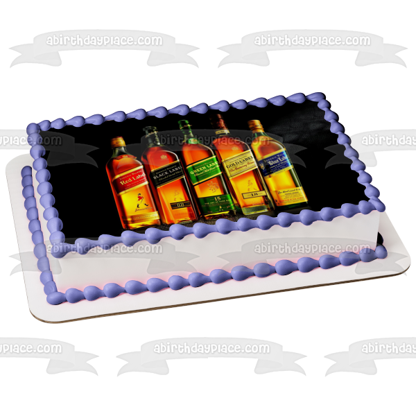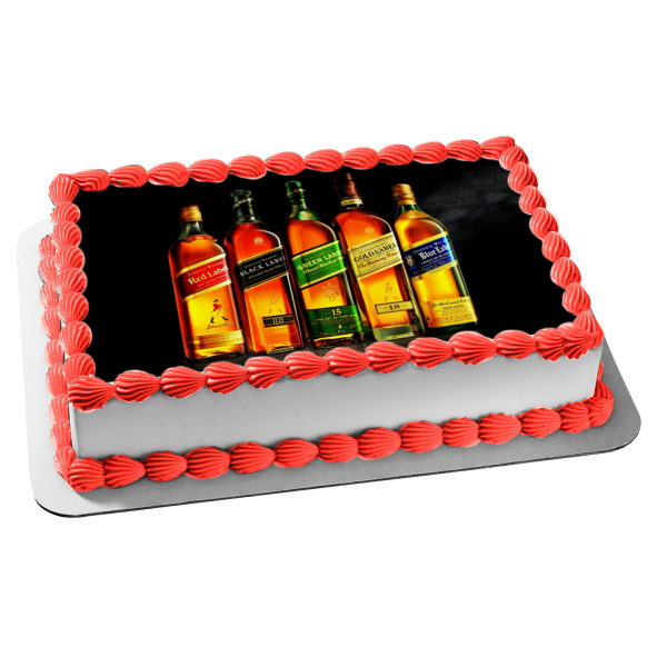 ¡Decora tu pastel con esta imagen de adorno comestible para pastel con temática de whisky escocés Johnnie Walker que incluye botellas de etiqueta roja, etiqueta negra, etiqueta verde, etiqueta dorada y etiqueta azul!