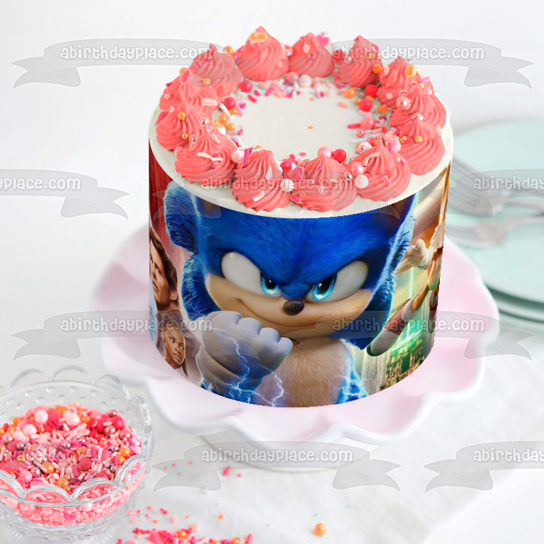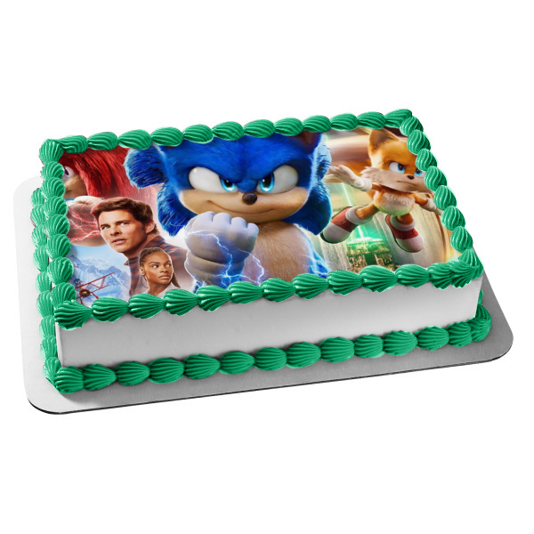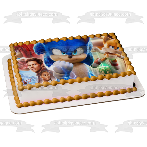 ¡Decora tu pastel con esta imagen de adorno comestible para pastel con temática de Sonic the Hedgehog 2 que presenta a Tails, Knuckles, Tom Wachowski y Maddie Wachowski!