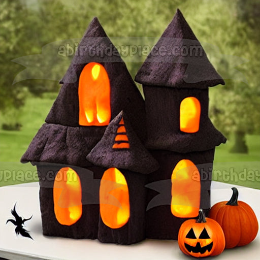 Feliz Halloween Calabazas y una casa encantada Imagen de adorno comestible para pastel ABPID56713