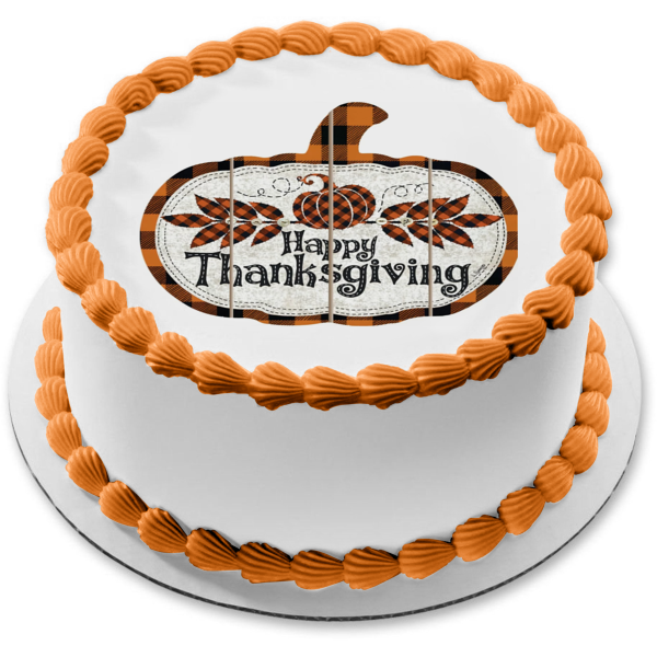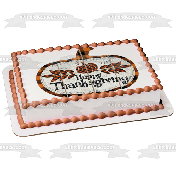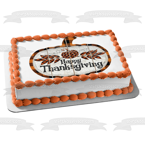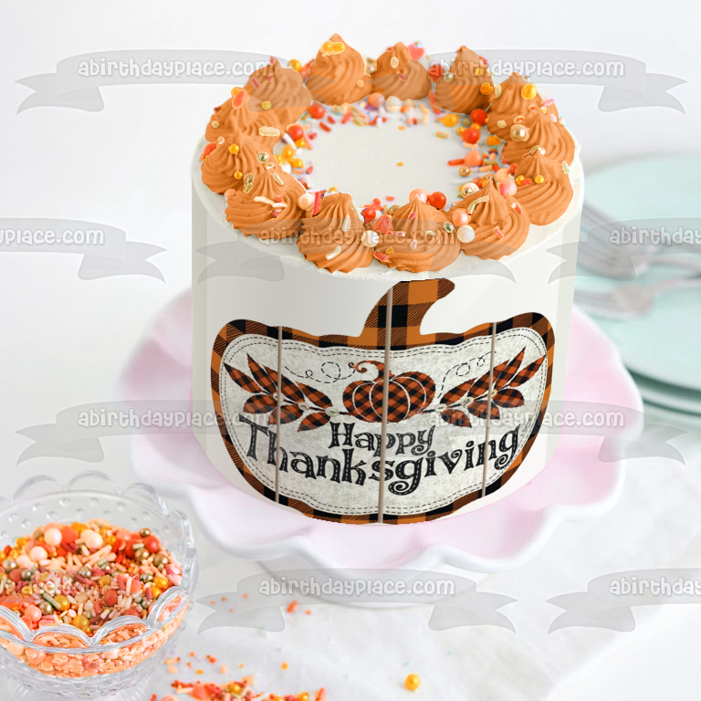 ¡Decora tu pastel con esta imagen de adorno comestible para pastel con temática de Feliz Día de Acción de Gracias con calabazas y hojas!