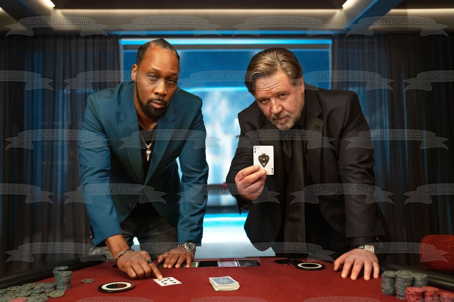 ¡Decora tu pastel con esta imagen de adorno comestible para pastel con temática de Poker Face que presenta a Jake Foley y Andrew Johnson!