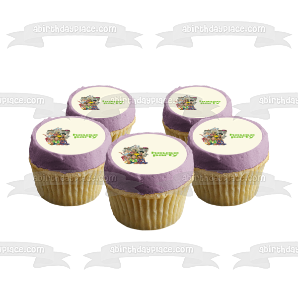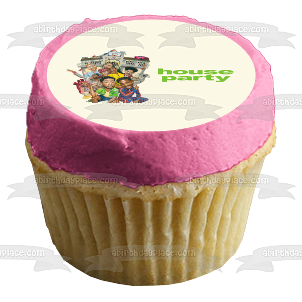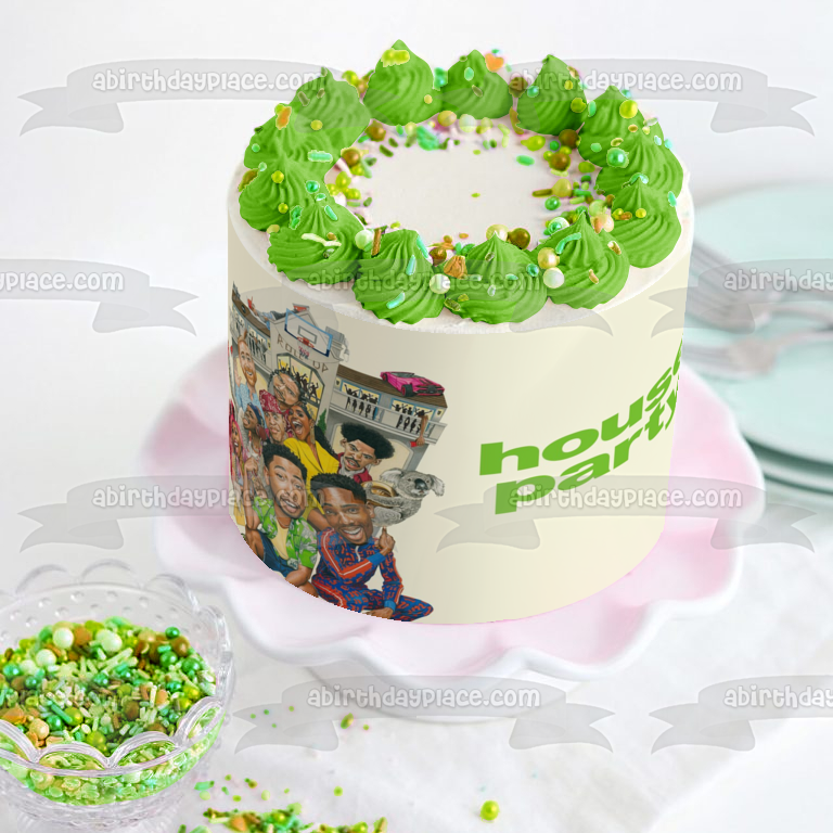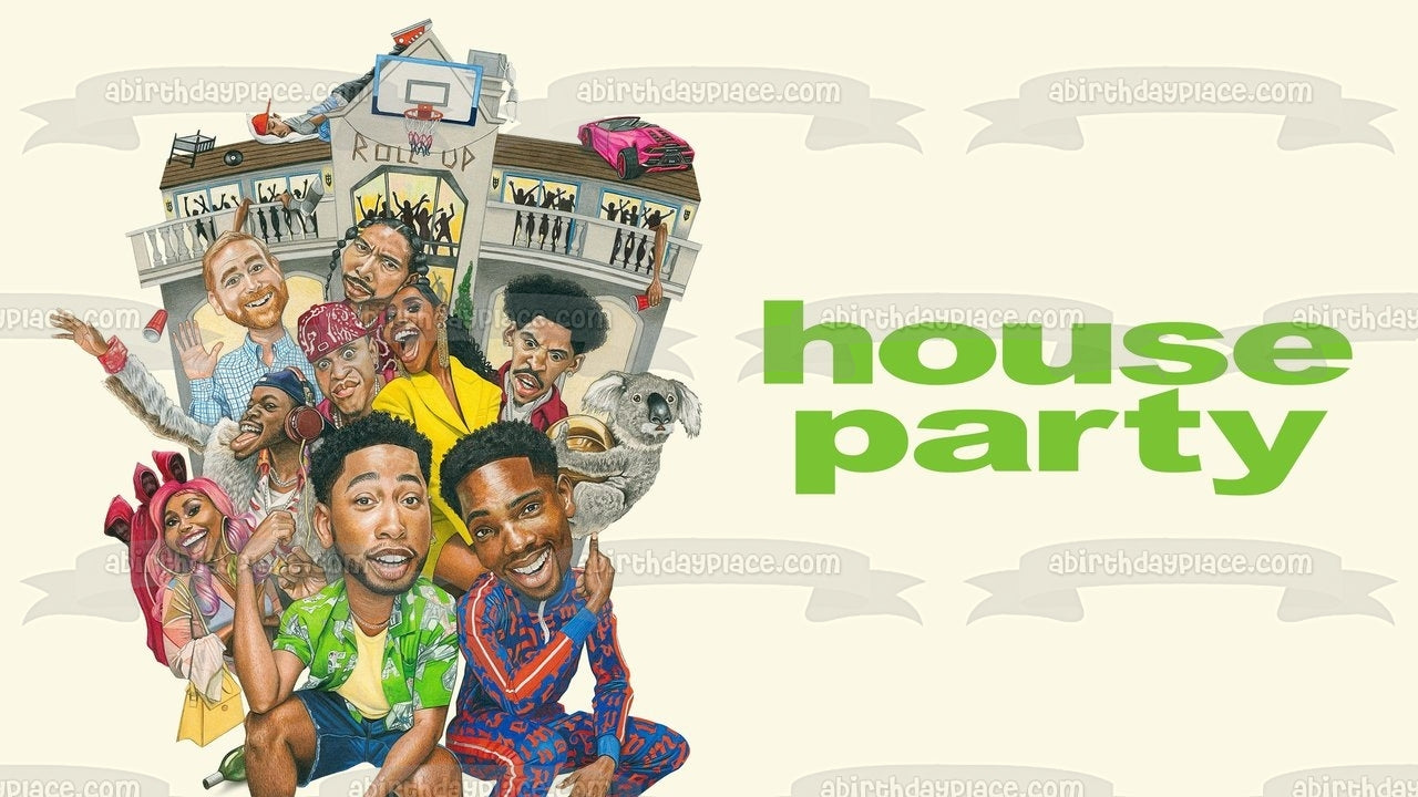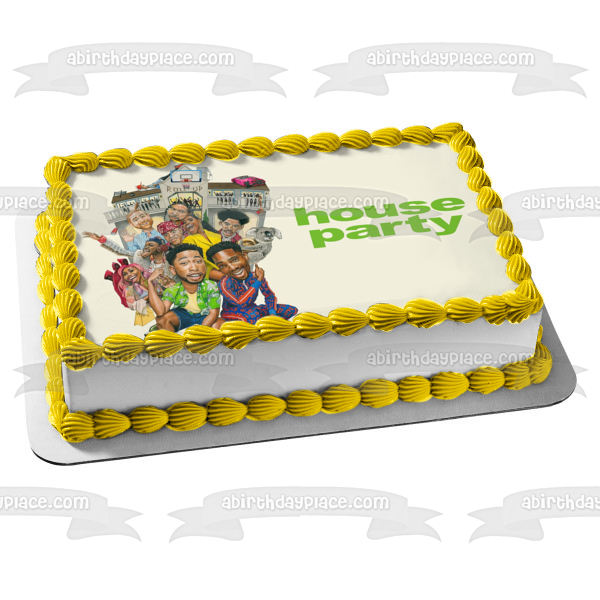 ¡Decora tu pastel con esta imagen de adorno comestible para pastel con temática de fiesta en casa que presenta a Kevin y Damon!