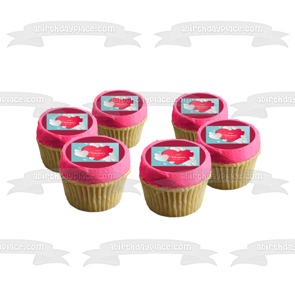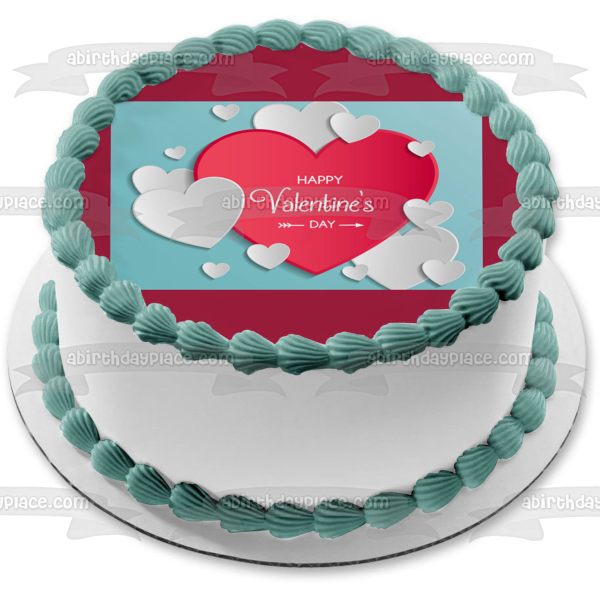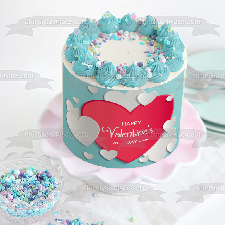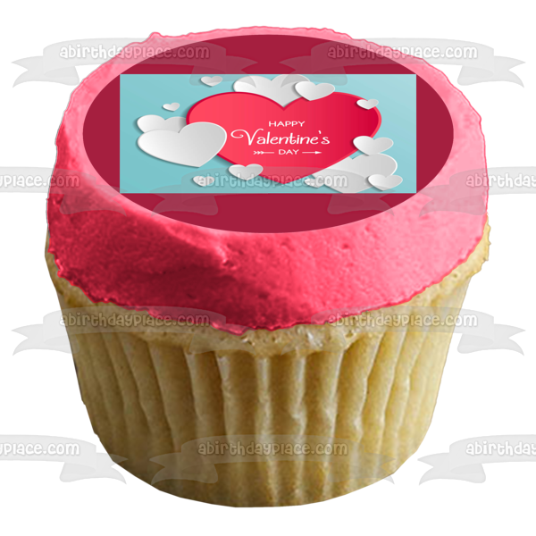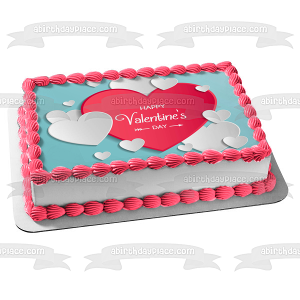 ¡Celebra este día especial con esta imagen de adorno comestible para pastel con temática de Feliz Día de San Valentín con corazones rosados y blancos!