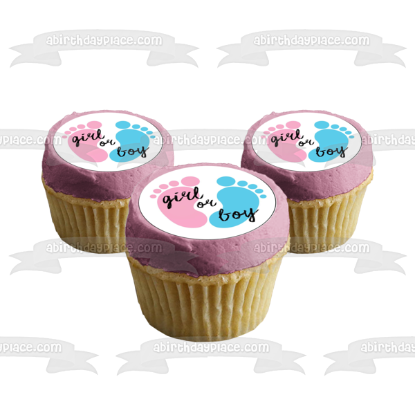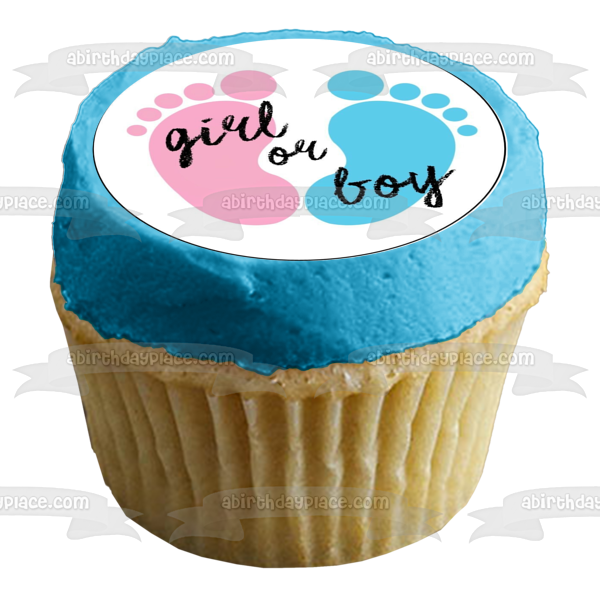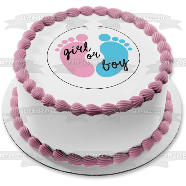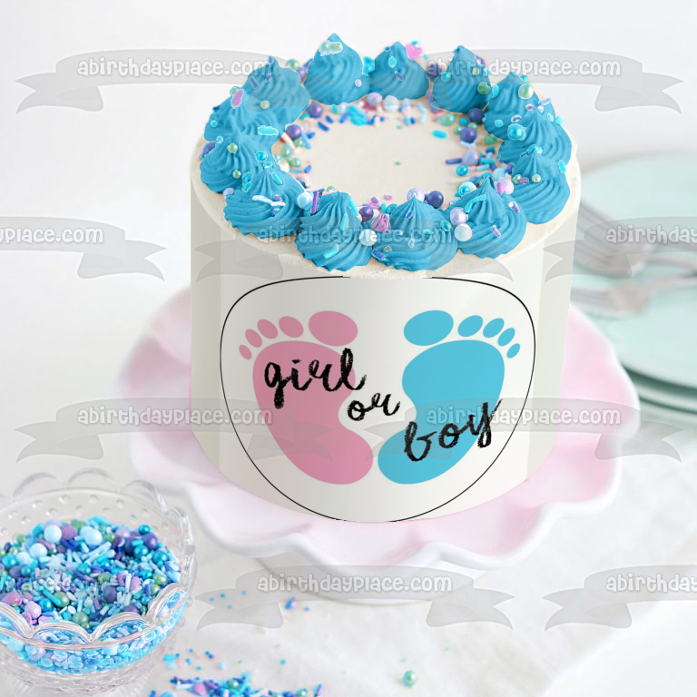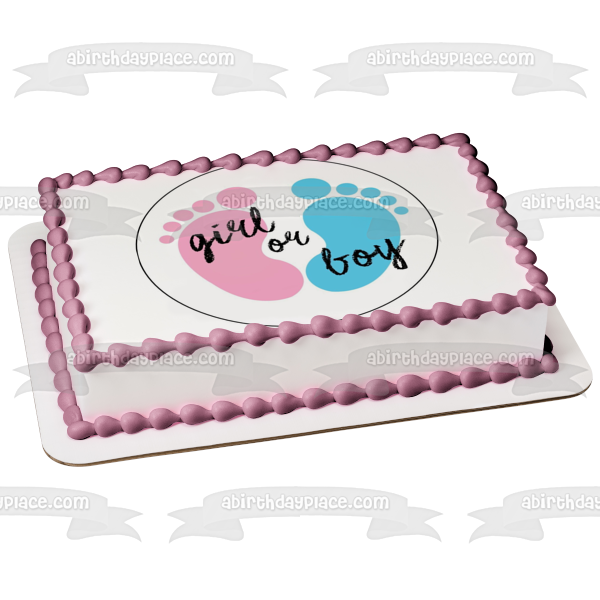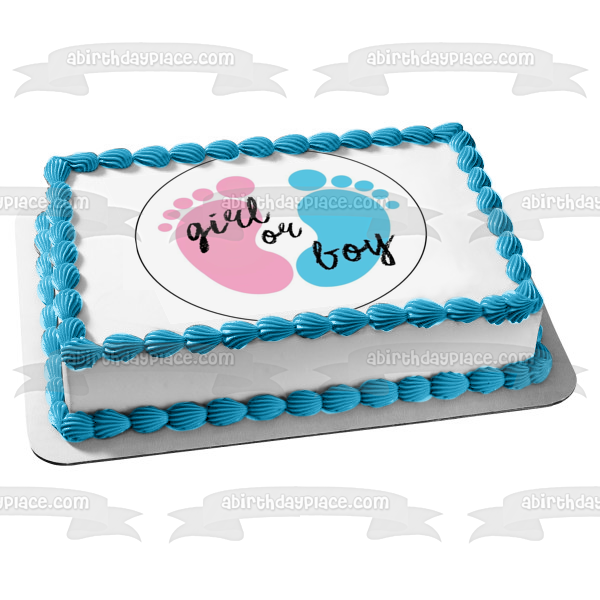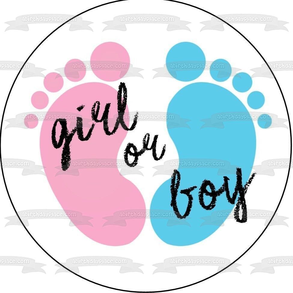 ¡Celebra tu fiesta de revelación de género con esta imagen de adorno comestible para pastel con temática de niña o niño que presenta huellas de bebé!