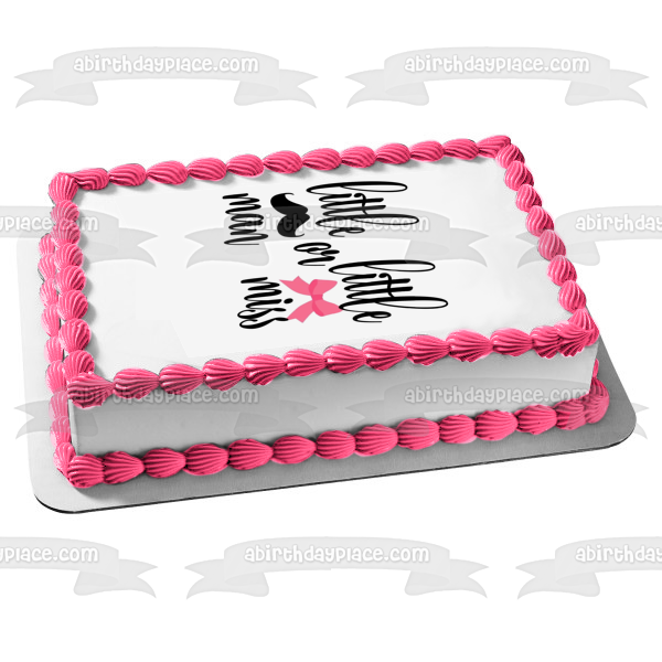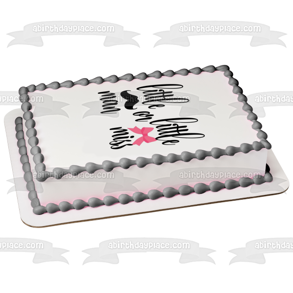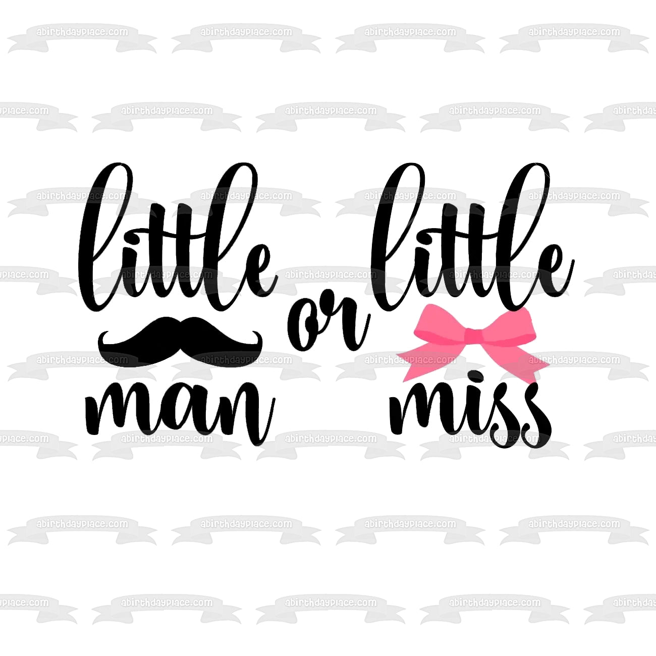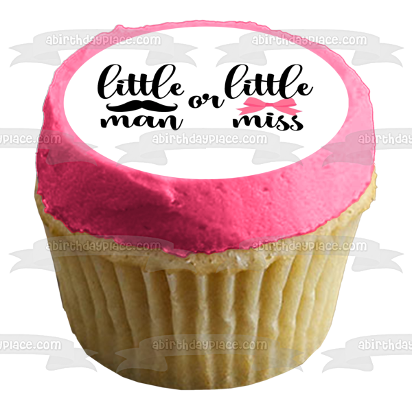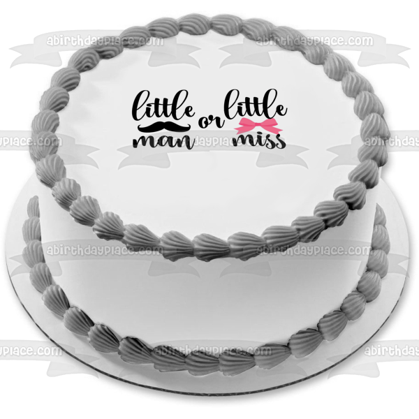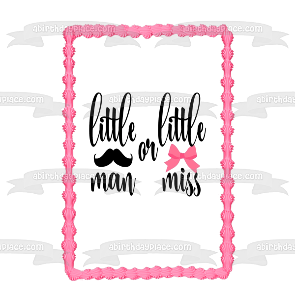¡Celebra tu fiesta de revelación de género con esta imagen de adorno comestible para pastel con temática de Hombrecito o Pequeña Señorita que presenta un bigote y un lazo rosa!