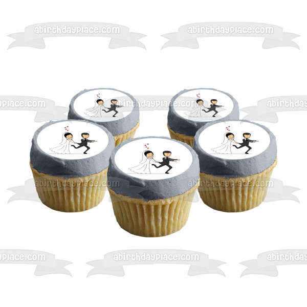 ¡Celebre el día de su boda con esta imagen de adorno comestible para pastel con temática de ilustración de novia y novio con corazones rojos!