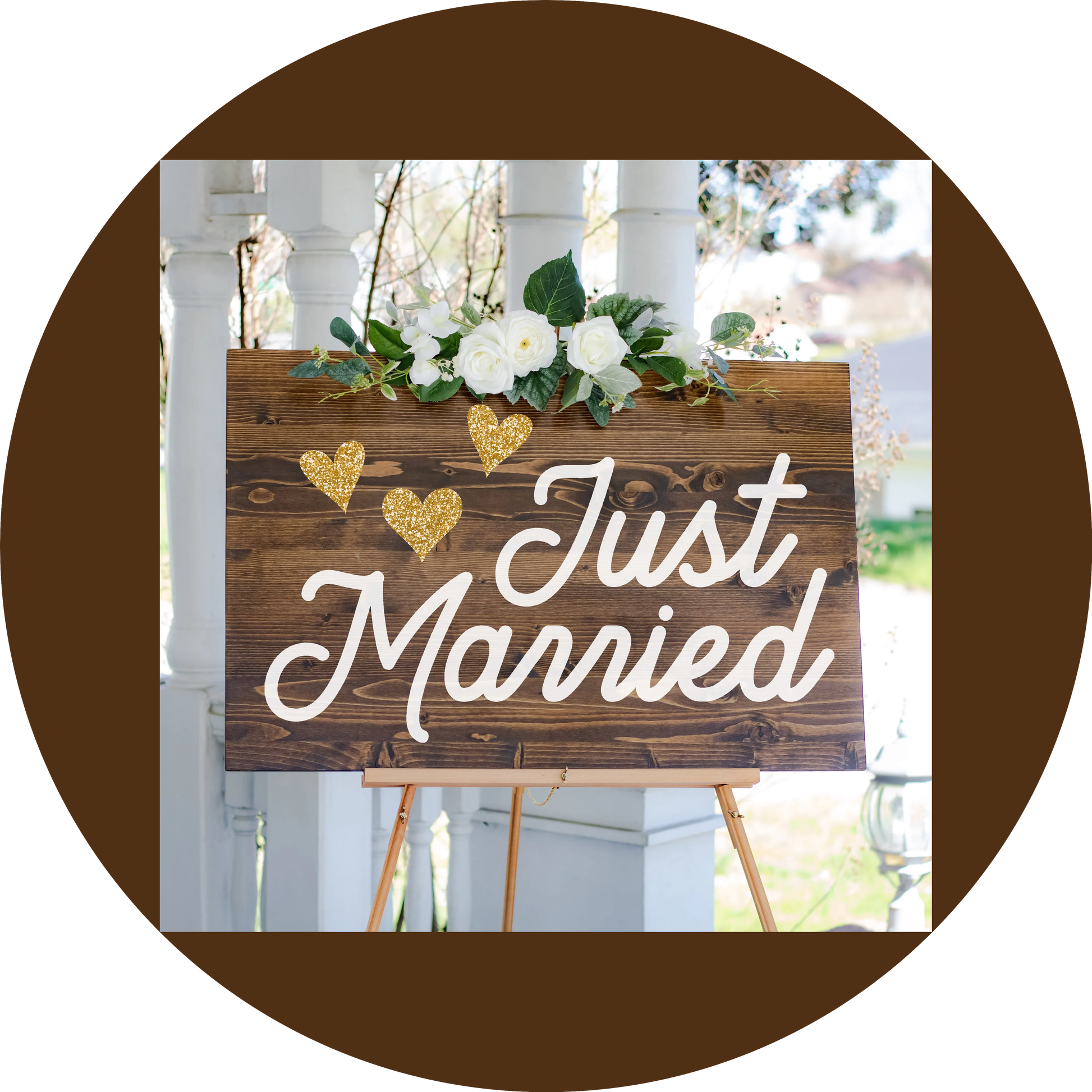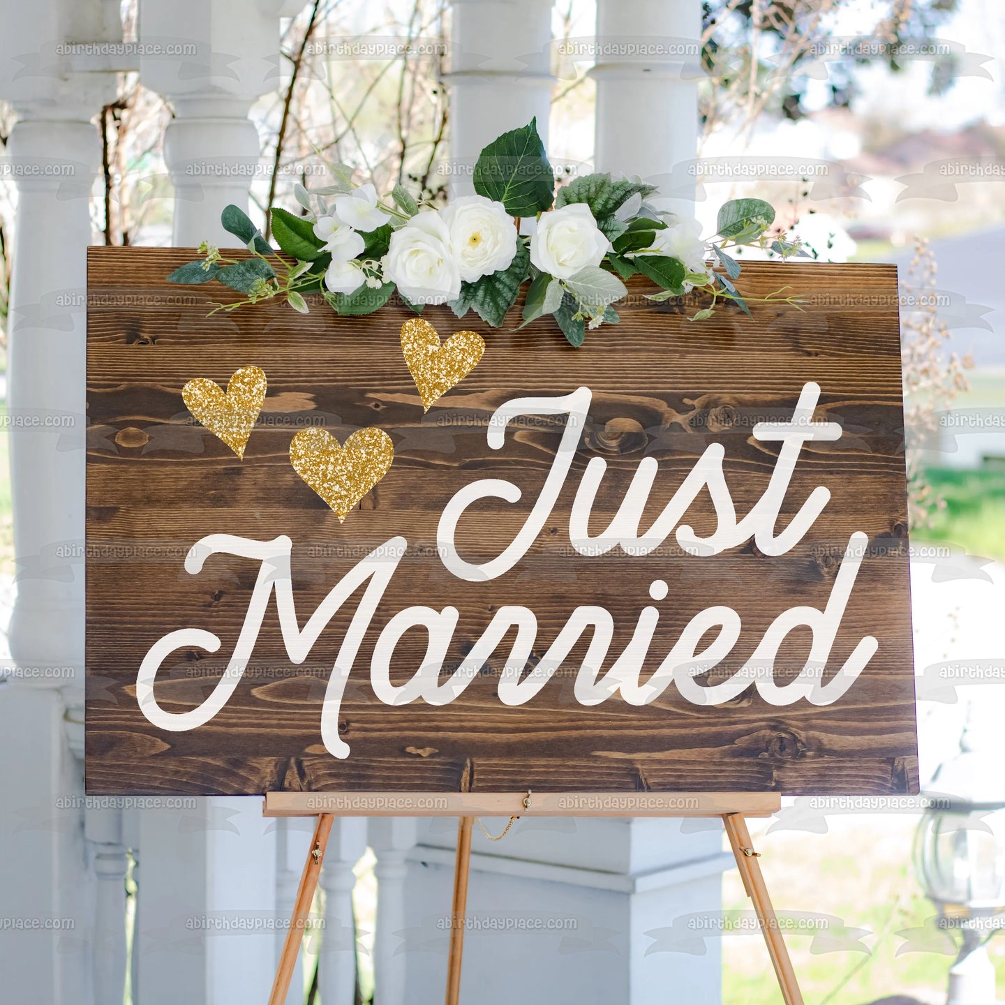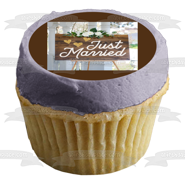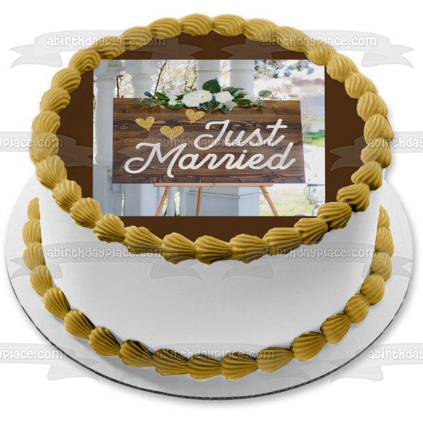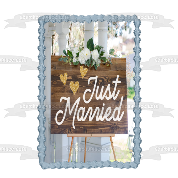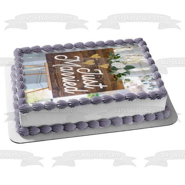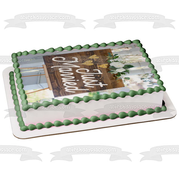 ¡Celebre el día de su boda con esta imagen de adorno comestible para pastel con temática de Recién Casados que presenta corazones y flores!