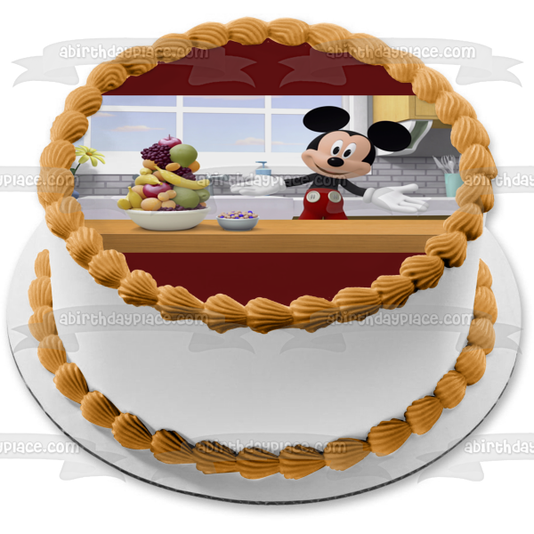 ¡Decora tu pastel con esta imagen de adorno comestible para pastel con temática de Mickey y Yo que presenta a Mickey Mouse y un frutero!