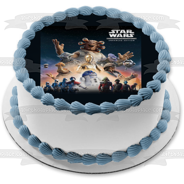 ¡Celebra a tu fanático de Star Wars Tales from the Galaxies con esta imagen de adorno comestible para pastel con Seezelslak, R2-D2 y C-3PO!