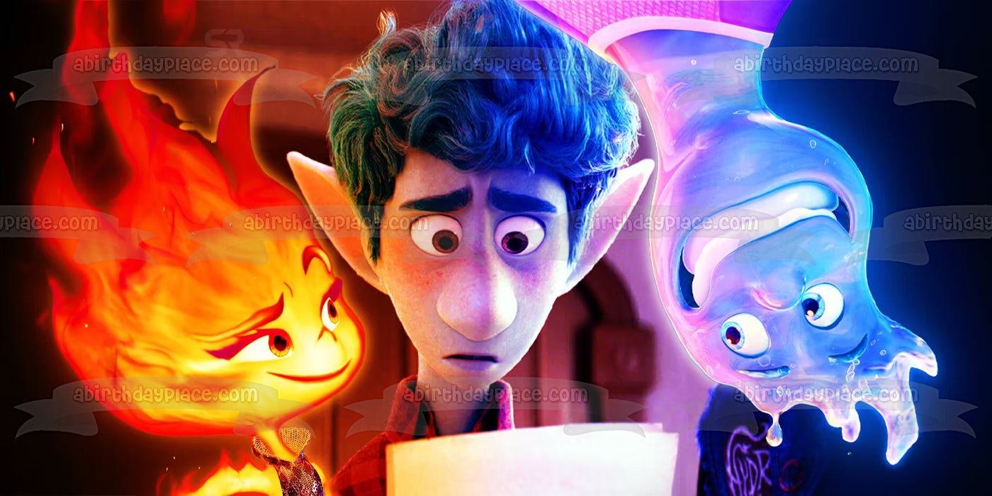 ¡Decora tu pastel con esta imagen de adorno comestible para pastel con temática elemental que presenta a Wade Ripple y Ember Lumen!
