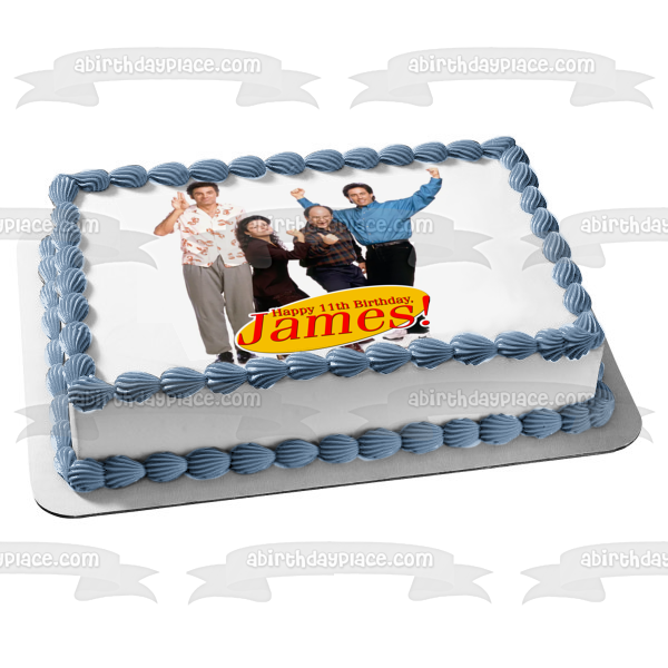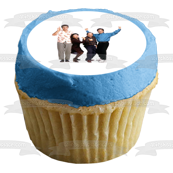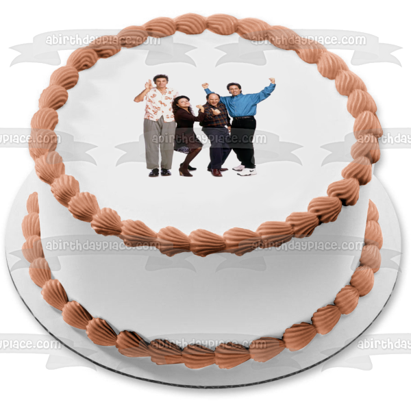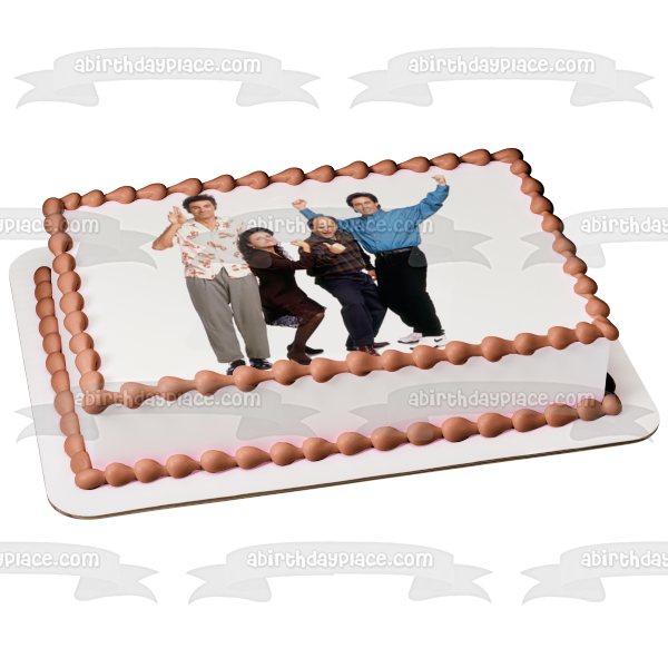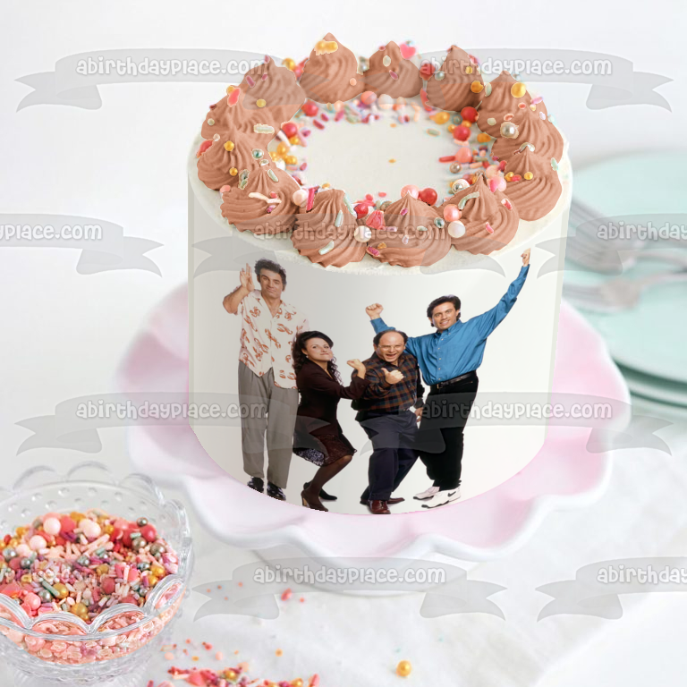 ¡Celebra tu ocasión especial con esta imagen de adorno comestible para pastel con temática de Seinfeld que presenta a Kramer, Elaine, George y Jerry!