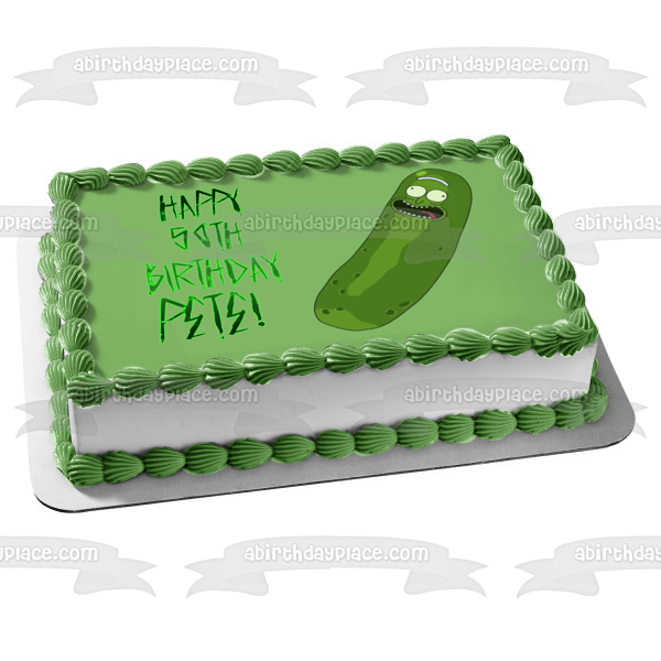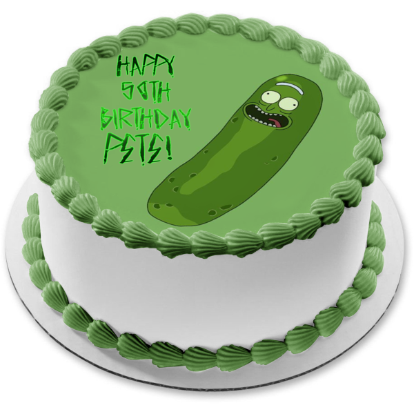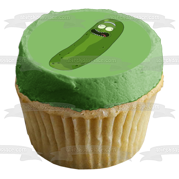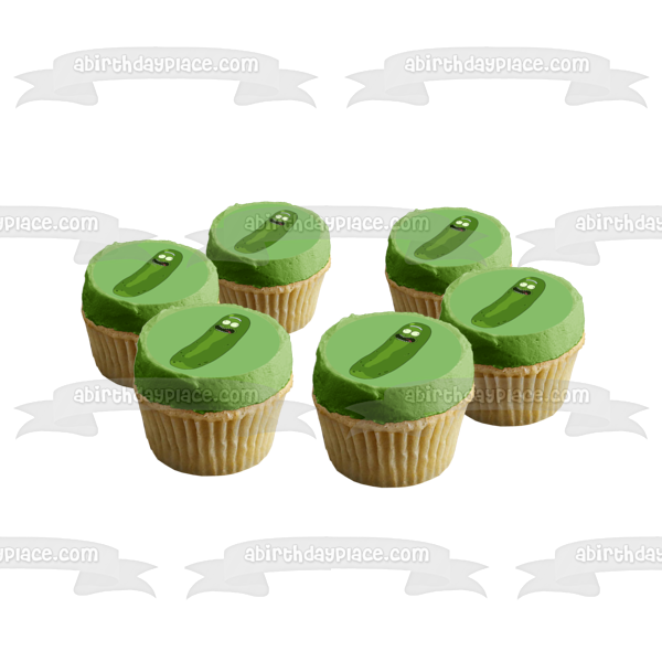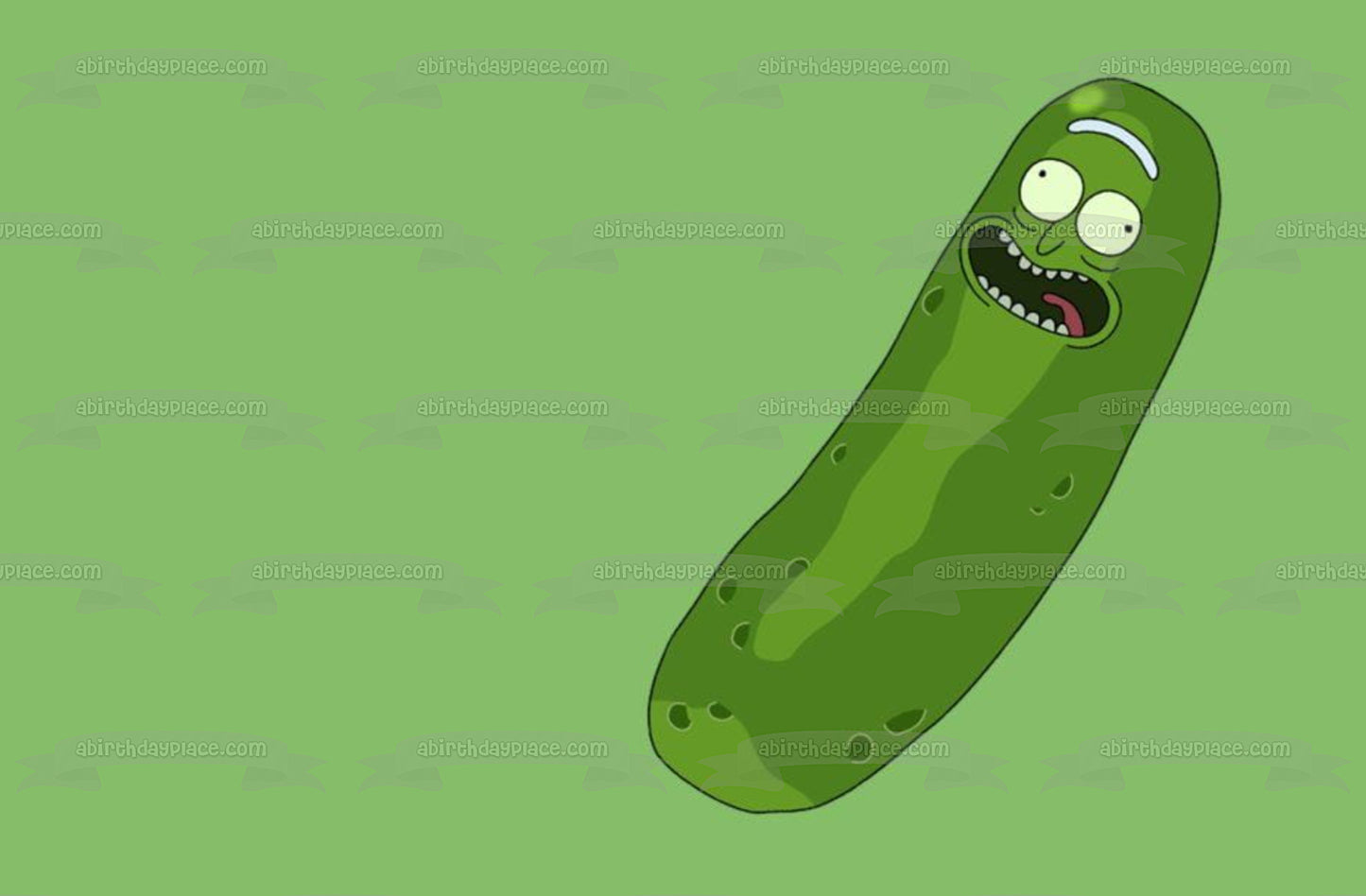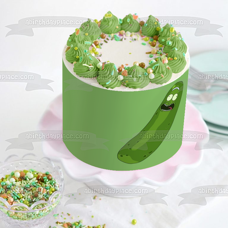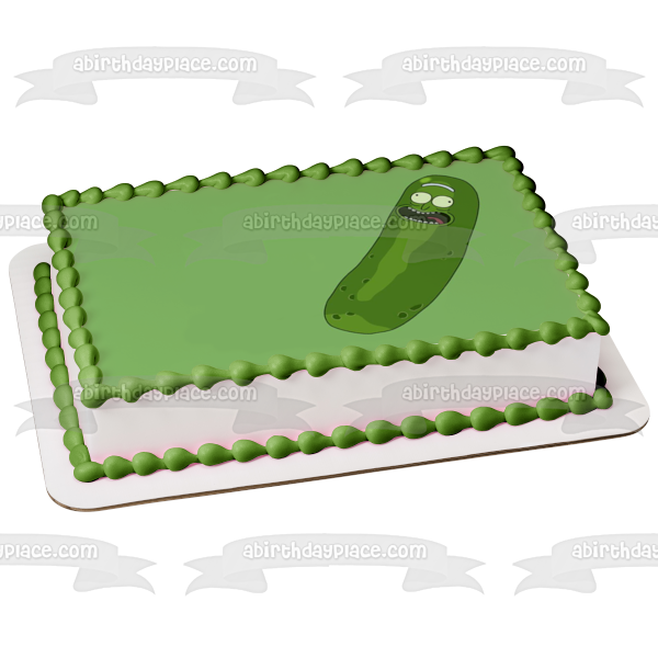 ¡Celebra a tu entusiasta de Rick y Morty con esta imagen de Edilbe Cake Topper que presenta a Pickle Rick con un fondo verde!