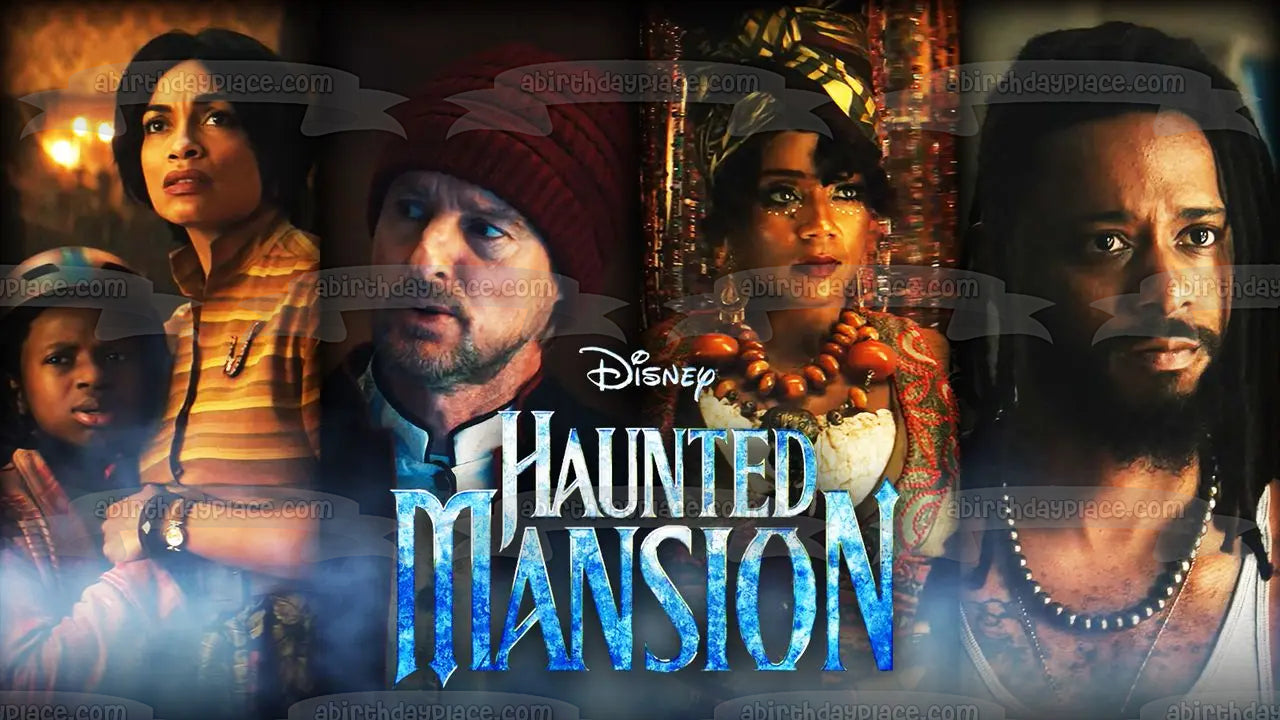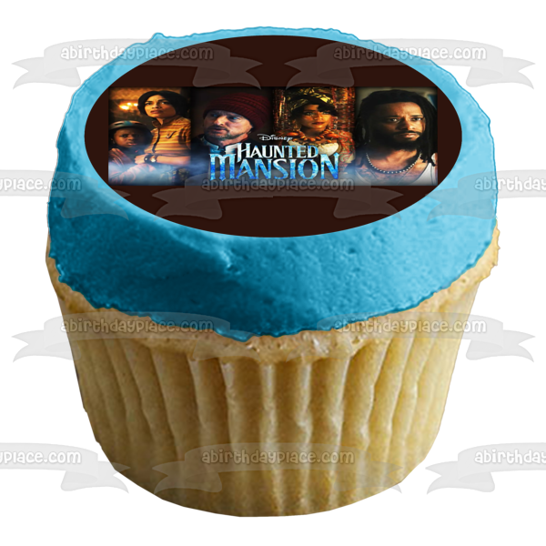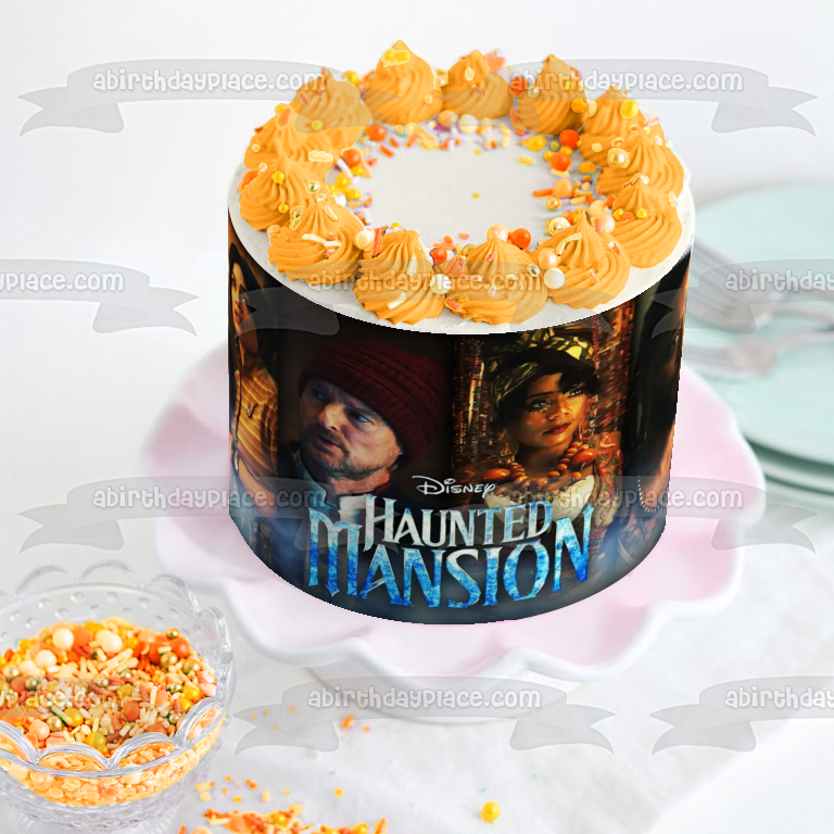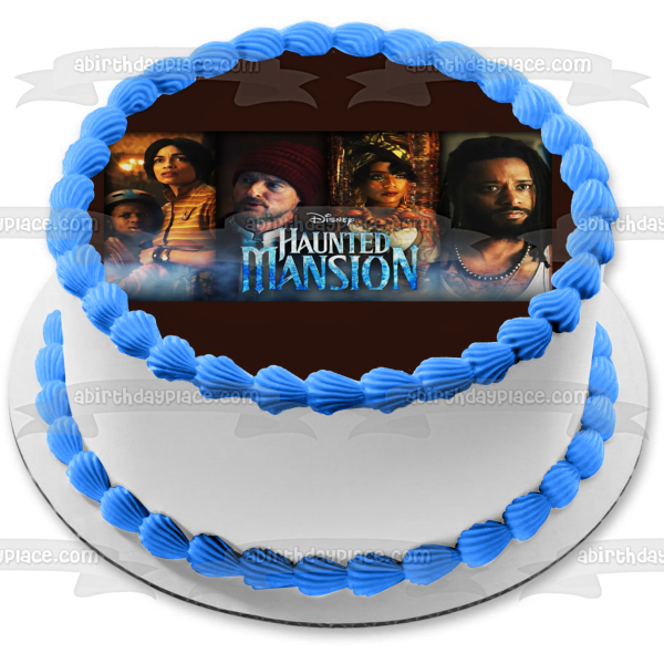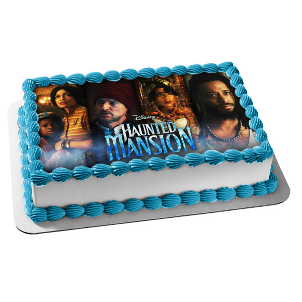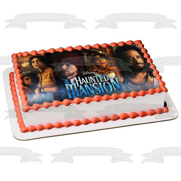 ¡Celebra a tu fanático de Haunted Mansion con esta imagen de adorno comestible para pastel con Ben Matthias, Harriet y Kent!