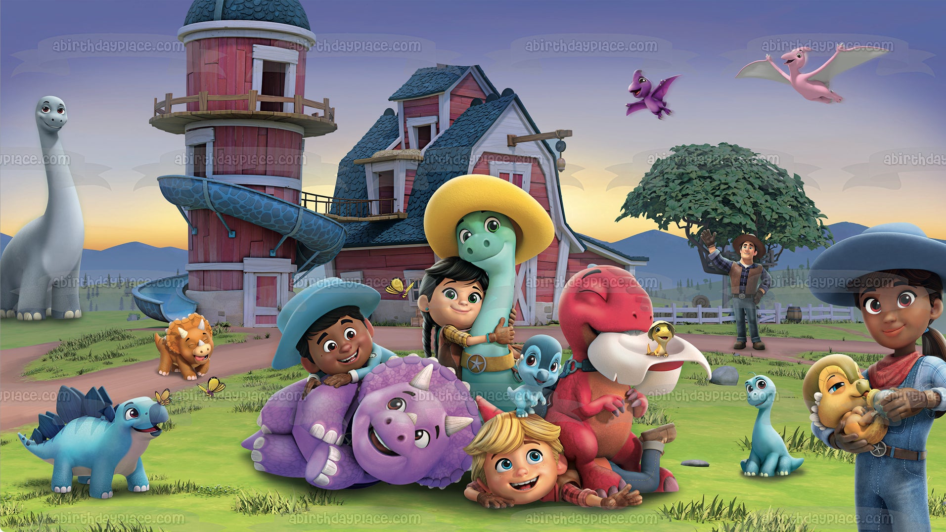 ¡Celebra tu día especial con esta imagen de adorno comestible para pastel con temática de Dino Ranch que presenta a Jon, Min y Miguel!