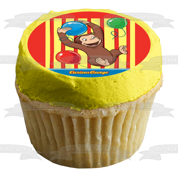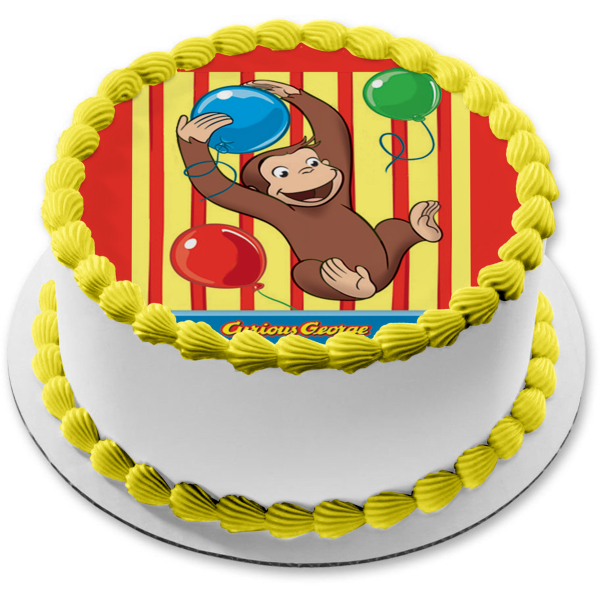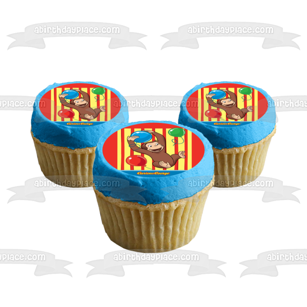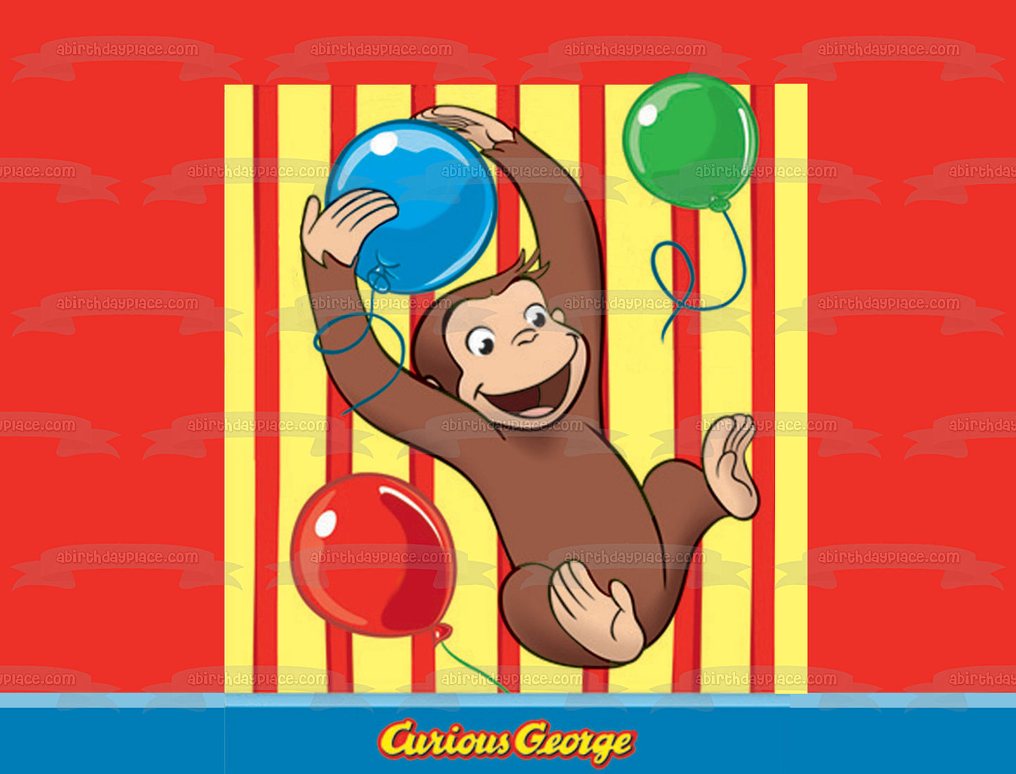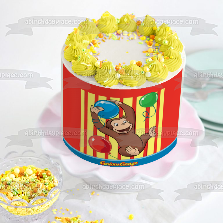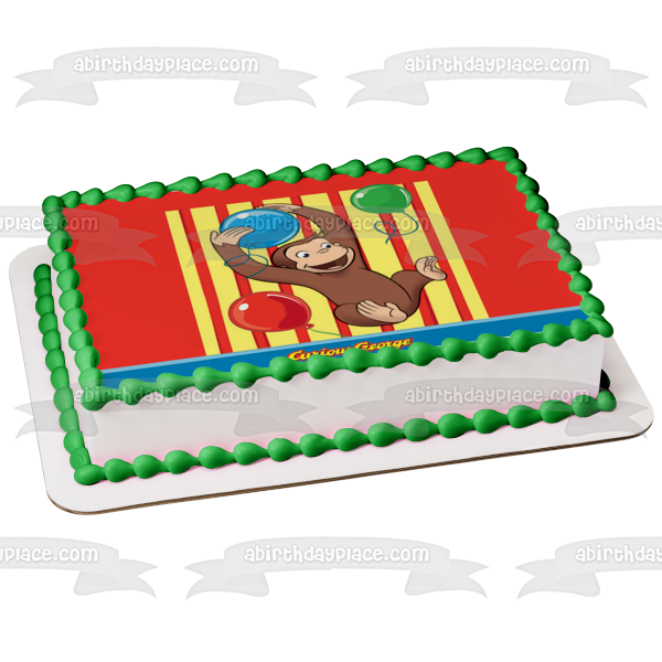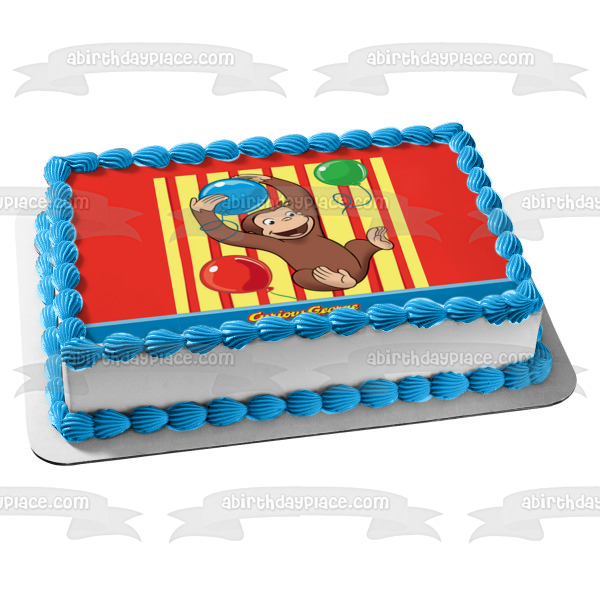 ¡Decora tu pastel con esta imagen de adorno comestible para pastel con temática de Jorge el Curioso que presenta globos y un fondo de circo!
