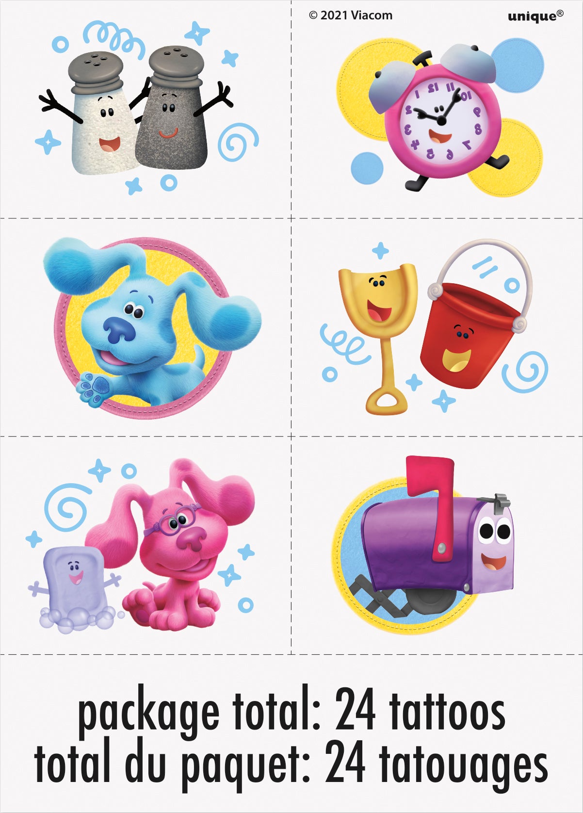 ¡Las pistas de Blue y tú! Los tatuajes son excelentes obsequios para llevar a casa o una actividad creativa para una fiesta. Los tatuajes muestran a Blue, Magenta, Slippery Soap, Shovel y Pail, y más personajes del programa.