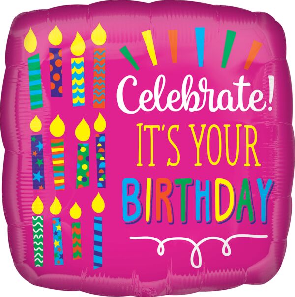 Añade vitalidad a su celebración con este colorido globo. Presenta el titular "Celebra tu cumpleaños" sobre un fondo rosa con velas de colores. Los globos se envían planos (sin inflar).