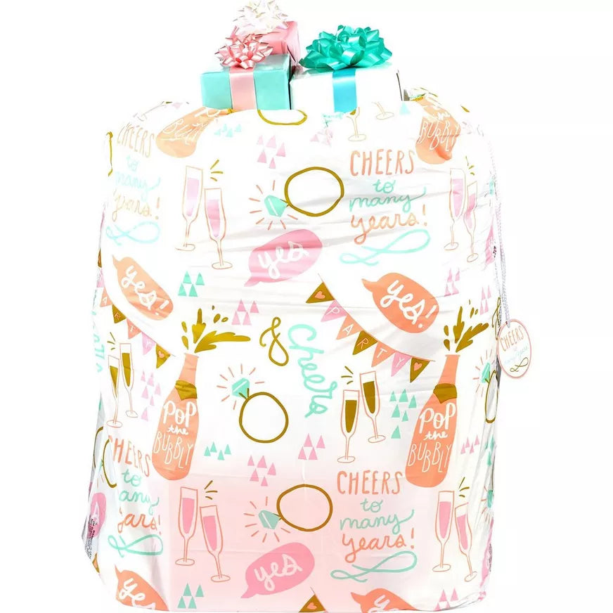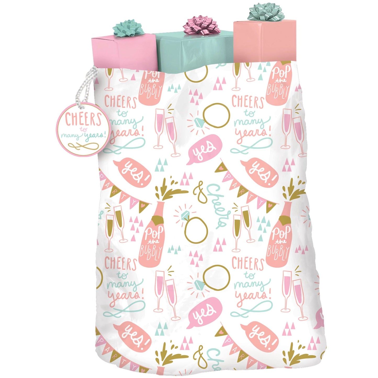 ¡Transporte sus regalos de boda con estilo con esta bolsa de regalo de boda dorada y rosa! Esta bolsa de plástico blanco presenta titulares como "Pop The Bubbly" y "Cheers To Many Years" rodeados de copas de champán impresas, anillos de diamantes y pancartas. La bolsa viene con una etiqueta de regalo a juego con forma de anillo de diamantes y dice "Cheers To Many Years" en el centro. ¡Llena esta bolsa con cordón con tus regalos de boda o despedida de soltera o úsala para envolver un regalo grande para alguien especial!