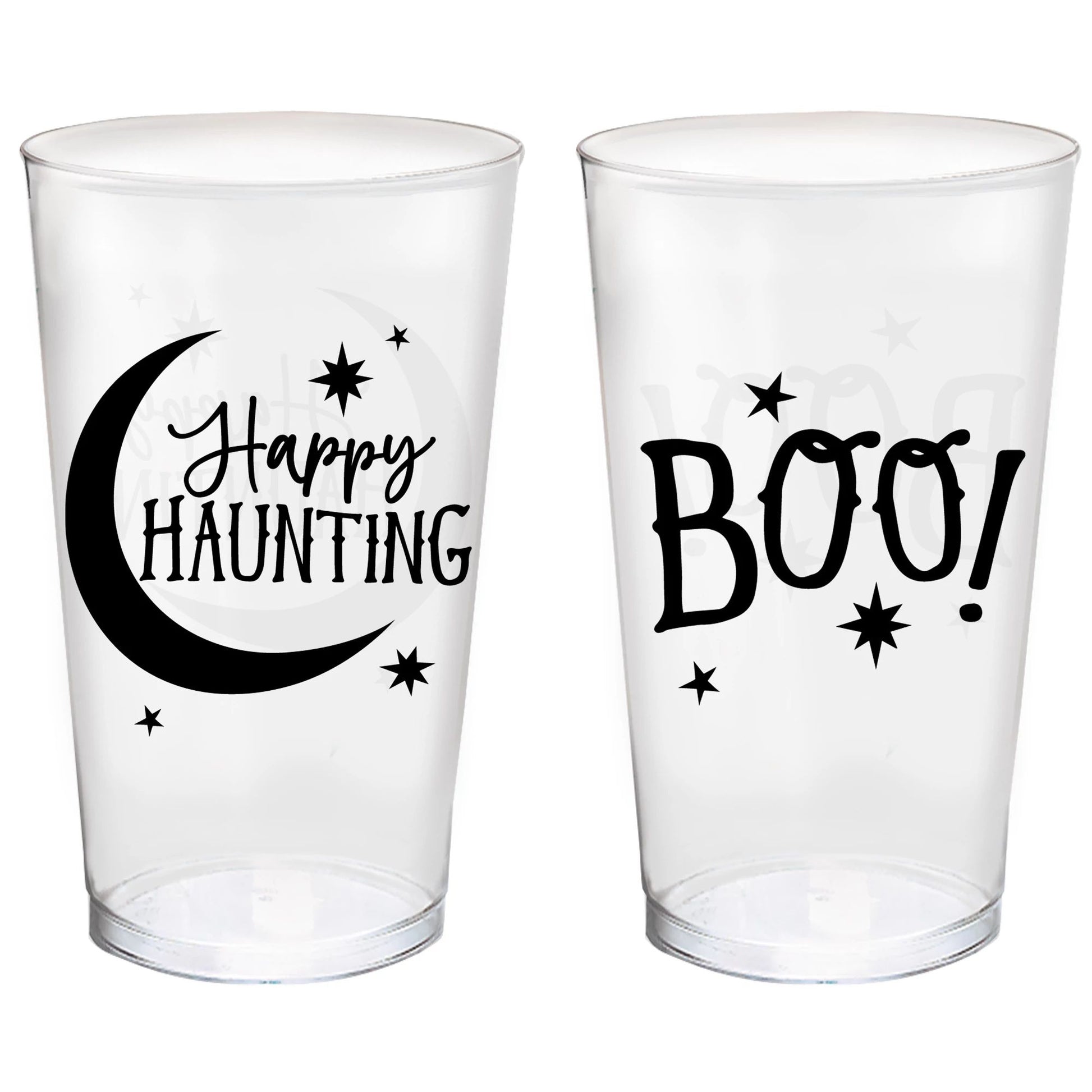 Sirva pociones para la fiesta de Halloween en vasos de plástico blancos y negros de la vieja escuela. Los vasos de plástico transparente sin BPA cuentan con los titulares "Happy Haunting" y "¡Boo!" además de íconos de Halloween.