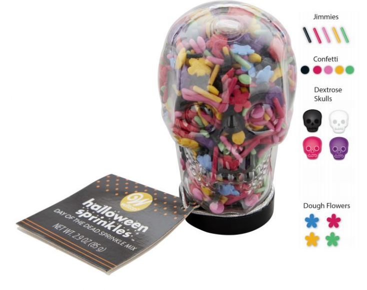 - La mezcla incluye una mezcla colorida de chispas con forma de calavera, chispas con forma de flor, confeti y palanquetas.