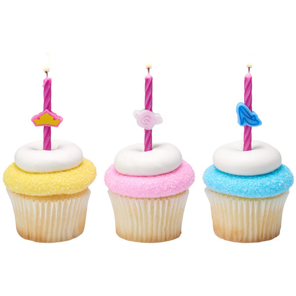 Las velas en espiral rosa presentan símbolos icónicos de las princesas de Disney, como la corona de Aurora, la rosa de Bella y la zapatilla de cristal de Cenicienta. 6 velas por paquete.