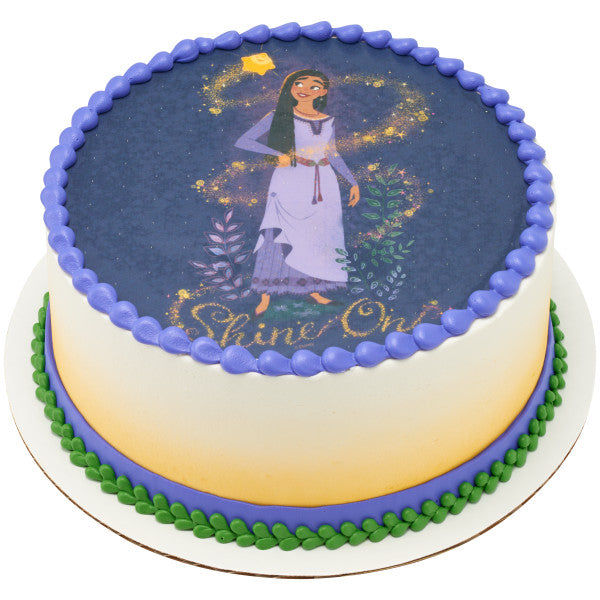 Esta imagen presenta a Asha y Star encima de la frase "Shine On". Completa la celebración con esta imagen de adorno de pastel comestible.