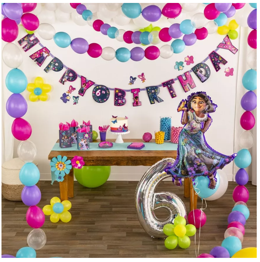 Hazles saber a todos cuántos años tiene tu pequeño fanático de Disney con un banner personalizable. Los recortes de letras de "Feliz cumpleaños" en azul brillante, rosa y morado presentan flores, mariposas y sus personajes favoritos: Mirabel, Luisa, Antonio e Isabela. ¡El círculo central se puede personalizar con la edad de tu fan de Encanto !