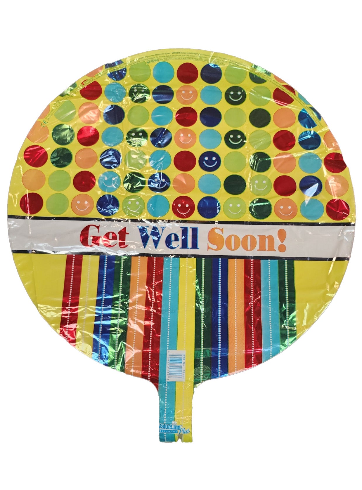 Este globo de aluminio redondo de 18" presenta rayas coloridas, caritas sonrientes y la frase "¡Que te mejores pronto!" en una fuente en bloque.