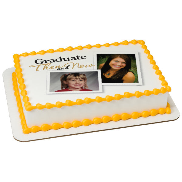 Desde el jardín de infantes hasta el último año, el graduado seguramente ha cambiado a lo largo de los años. ¡Añade un toque personal con este marco de imagen comestible para decoración de tartas! La imagen dice "Graduarse entonces y ahora" y es excelente para agregar una imagen de los primeros grados de la escuela de posgrado y la imagen de su último año.