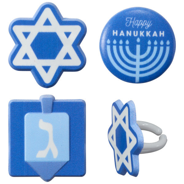 Añade un toque festivo a tus celebraciones de Hanukkah con este juego de anillos para cupcakes de Hanukkah. El surtido incluye la Estrella de David, una menorá y un dreidel.