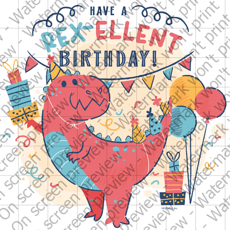 Esta imagen presenta un dinosaurio de dibujos animados sosteniendo regalos y la frase "¡Que tengas un cumpleaños de Rex-Elent!" Completa la celebración con esta imagen de adorno de pastel comestible.