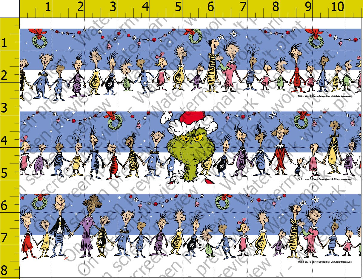 El Grinch y los ciudadanos de Who-ville adornan estas tiras de imágenes comestibles para decoración de tartas.