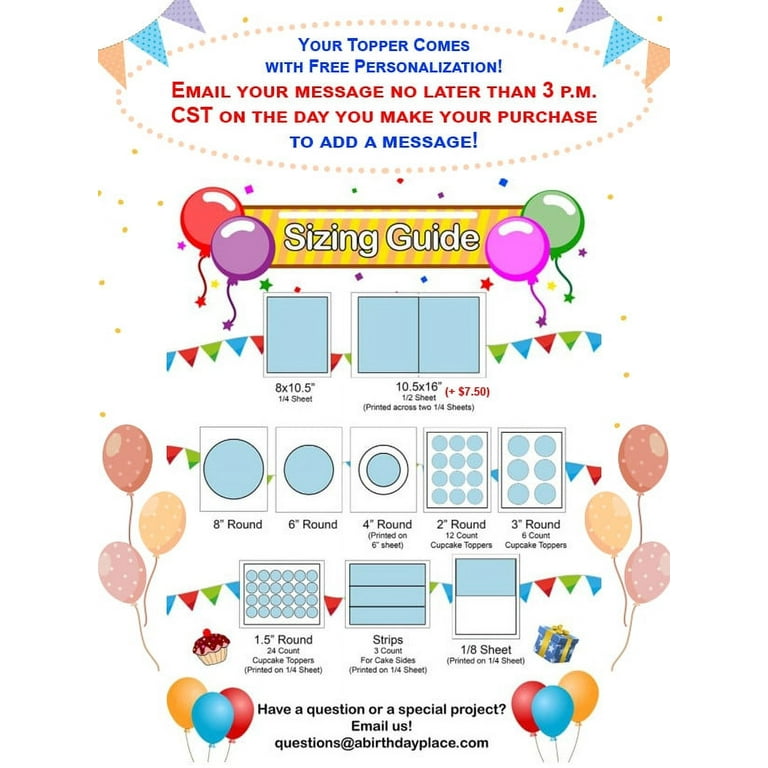 El arte del glaseado comestible es una excelente manera de hacer que un pastel y cupcakes luzcan fantásticos y profesionales. Éstas son una manera fácil y económica de hacer que su pastel parezca una obra maestra. Todas las imágenes de glaseado vienen con instrucciones. Simplemente retire el glaseado comestible del respaldo y colóquelo encima de un pastel o cupcakes recién glaseados. Después de 15 a 25 minutos, el glaseado comestible se mezclará con el glaseado para darle a tu pastel un aspecto profesional. Las impresiones se imprimen profesionalmente en láminas de glaseado comprimidas. Cada adorno se envía en una bolsa de plástico con cierre hermético. ¡No es necesaria refrigeración!