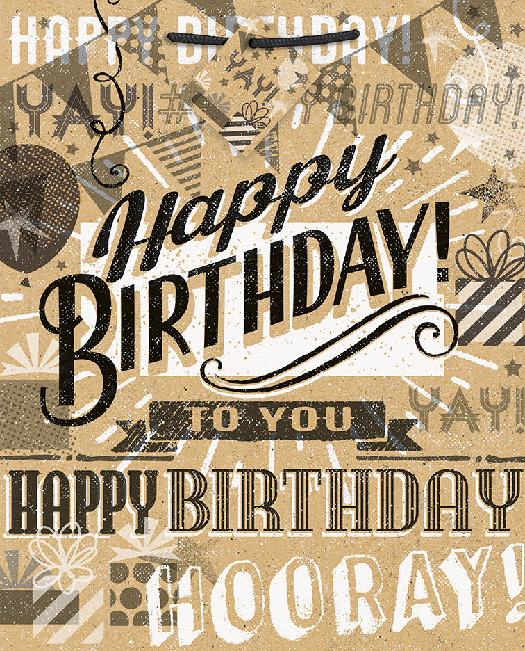 Esta bolsa presenta múltiples frases de celebración de cumpleaños. Bolsa de regalo reutilizable, de alta calidad y maravillosamente diseñada con una paleta de colores que se adapta a cualquier tema de cumpleaños complementada con una expresiva tipografía en negro.