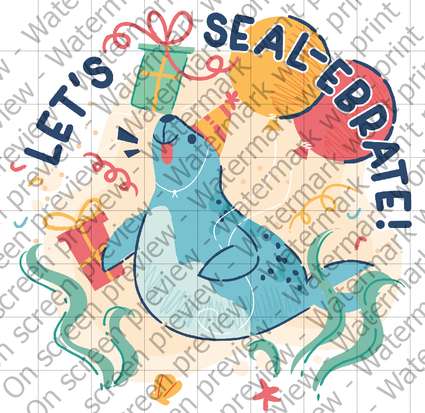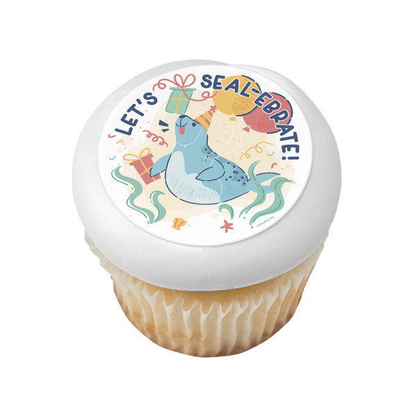 Esta imagen presenta una foca con un sombrero de cumpleaños con la frase "¡Let's Seal-Ebrate!" Completa la celebración con esta imagen de adorno de pastel comestible.