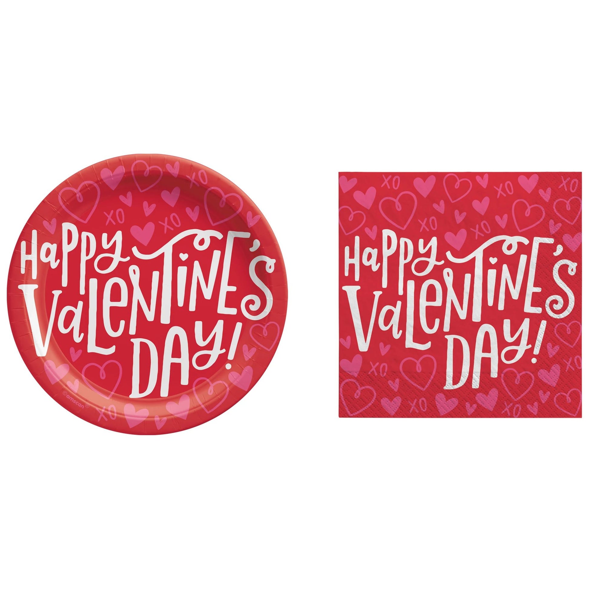 Crea una escena encantadora en poco tiempo con este paquete combinado de vajilla para el día de San Valentín. Incluye un juego de platos y servilletas de papel rojos a juego, todos con el titular "Feliz día de San Valentín" y garabatos de corazones de fondo. El conjunto es perfecto para fiestas en el aula o grandes reuniones del Día de San Valentín.