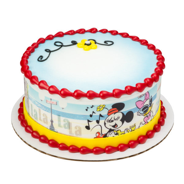 Deje volar su imaginación con esta escena clásica de Mickey Mouse y sus amigos diseñada para envolver los lados de un pastel.
