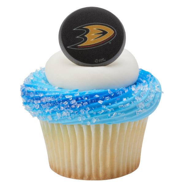 ¡Los fanáticos del hockey pueden celebrar con estos anillos de hockey NHL® Anaheim Ducks®! Estos anillos presentan el logotipo del equipo con licencia oficial de la NHL®. Ideal para cupcakes, donas o incluso para rematar el aspecto de un pastel.