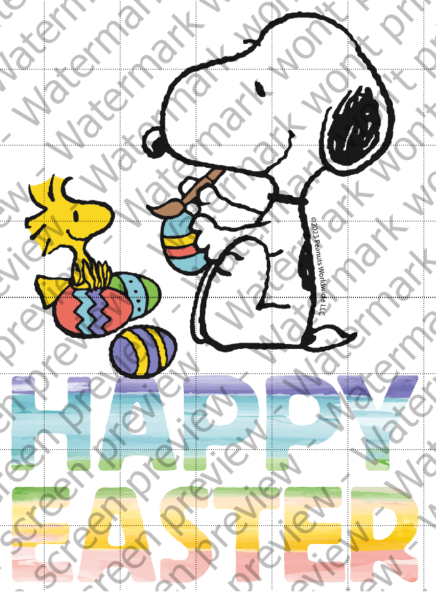 Esta imagen muestra a Snoopy y Woodstock decorando huevos de Pascua encima de la frase "Feliz Pascua" en colores pastel del arco iris. Completa la celebración con esta imagen de adorno de pastel comestible.