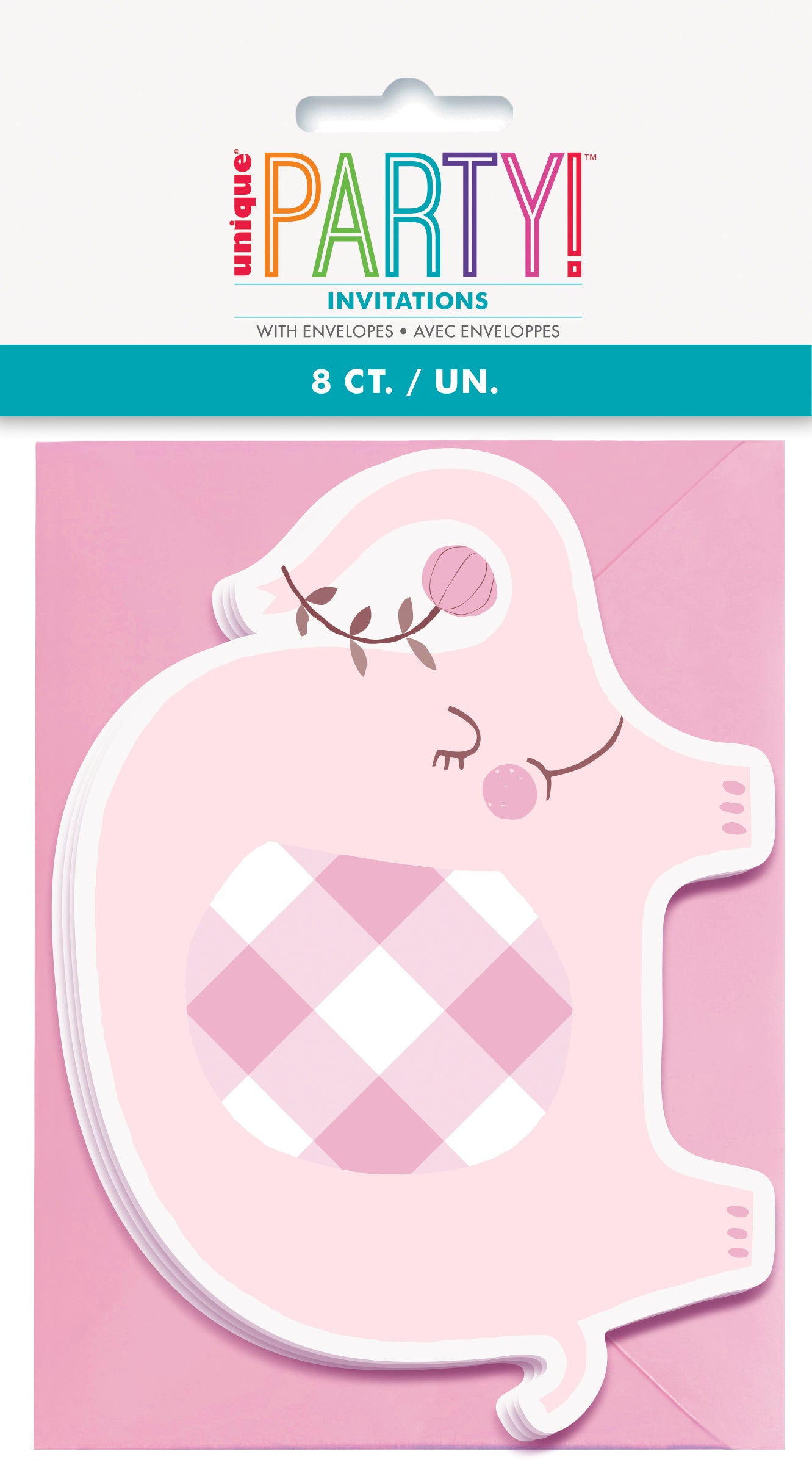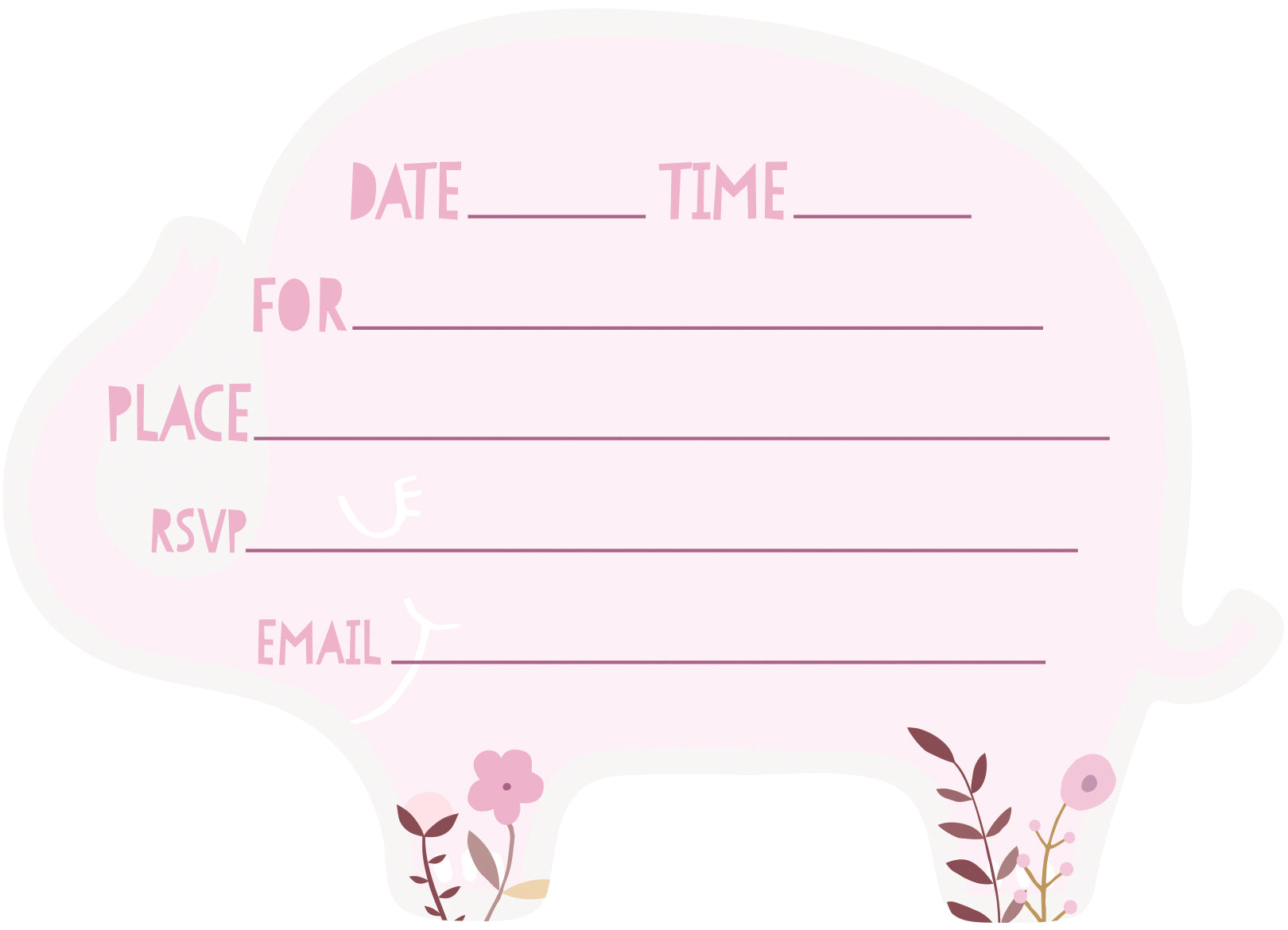 Estas invitaciones de elefantes florales rosas miden aproximadamente 6" x 4". Tienen líneas para toda la información importante de la celebración: fecha, hora, lugar, confirmación de asistencia y correo electrónico. 8 invitaciones y 8 sobres por paquete.