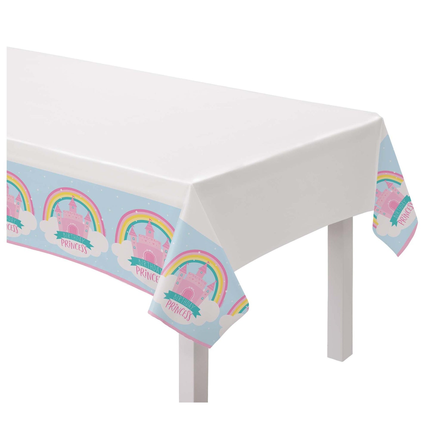 Establece las bases de tu mesa con este protector de mesa de plástico. Los bordes tienen un patrón repetido de un castillo de princesa sentado sobre una nube con un arco iris y la frase "Princesa de cumpleaños".